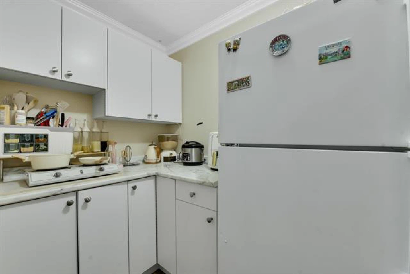 Kitchen with hot plate, Microwave , full Refrigerator and sink