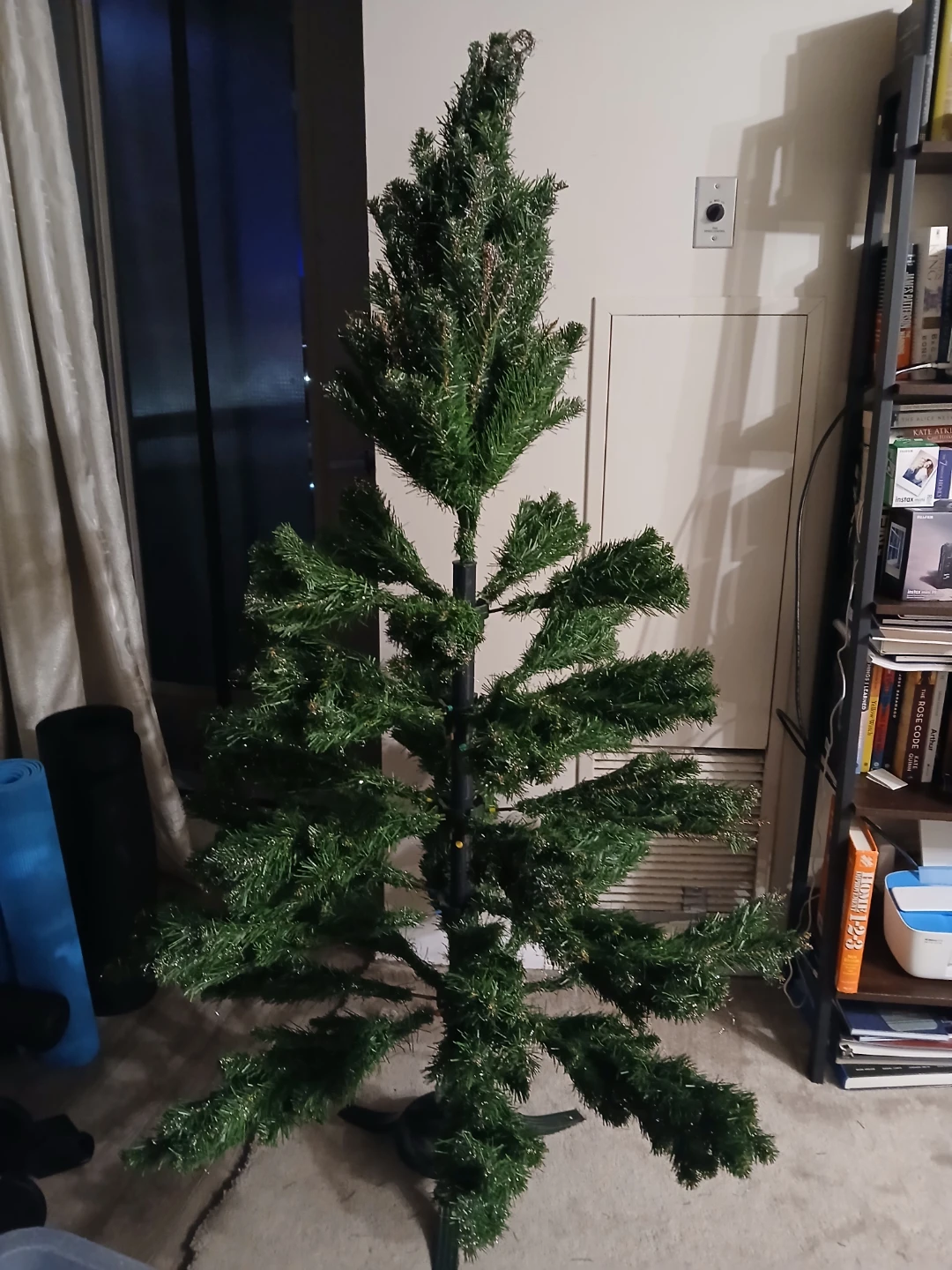 - Easy and quick to assemble Christmas tree. 66 inches tall. The branches fold up and open up and you slit each "branch" into a slit in the middle trunk