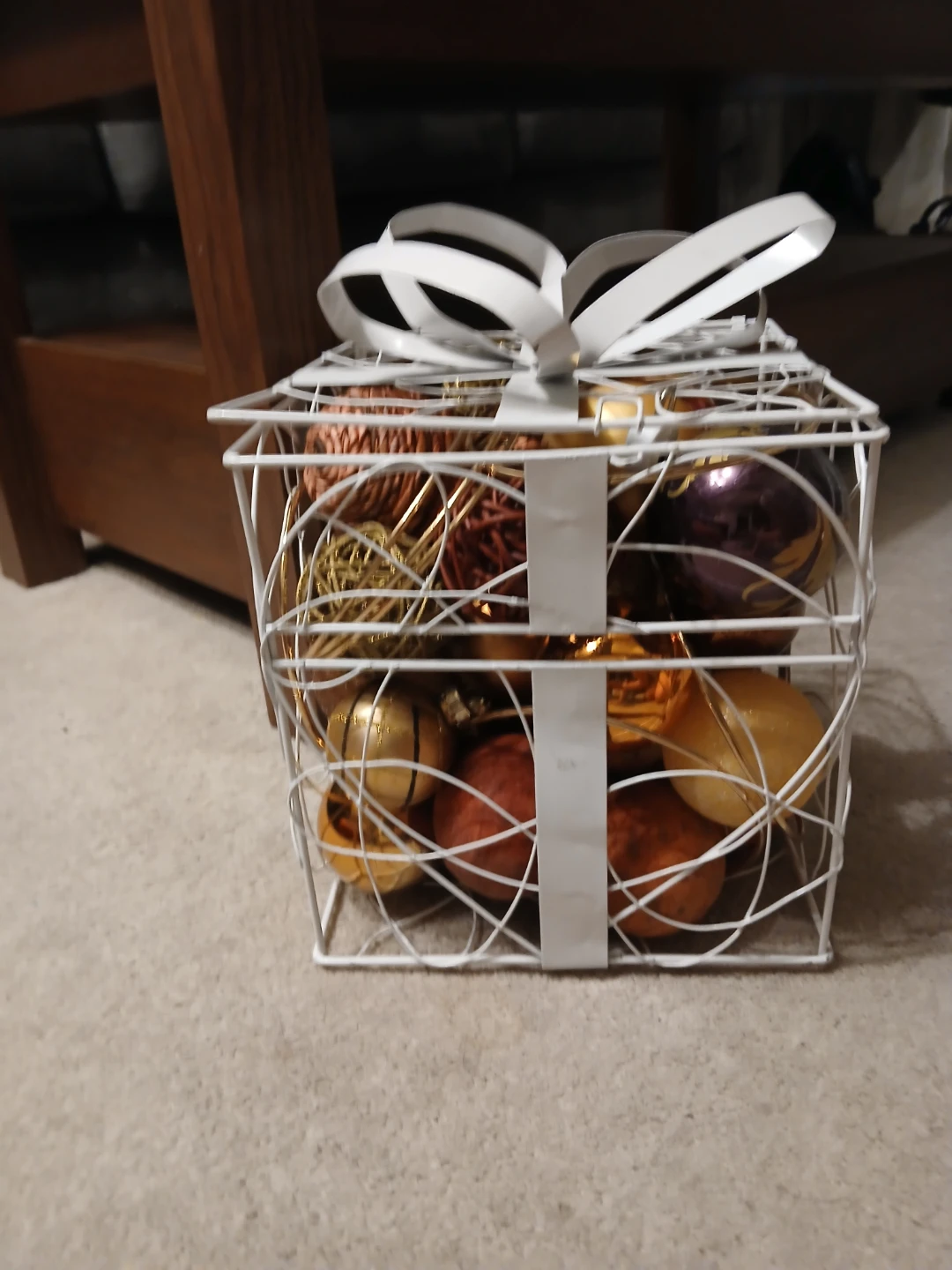 - Cute holiday present looking decoration with holiday balls inside (8 x 8 x 8 inches)