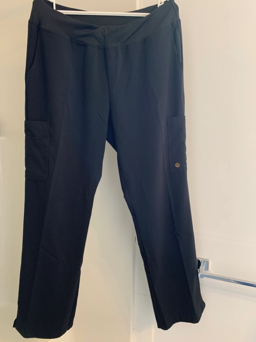 Selling a pair of black scrub pants. They're in great condition and feature convenient pockets. Perfect for work or everyday wear!