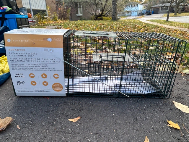 156This Advantek catch and release live animal trap is designed for safely capturing raccoons, squirrels, feral cats, and other small to medium nuisance animals. The trap is in excellent condition. Never used. It features a sturdy metal construction with a sensitive trigger mechanism for reliable captures. 2 traps - large and small Specifications: * Brand: Advantek * Type: Live Animal Trap * Suitable for: Raccoons, squirrels, feral cats, and other small to medium nuisance animals * Features: Catch and release, sensitive trigger, durable construction * Condition: new Payment: Cash accepted