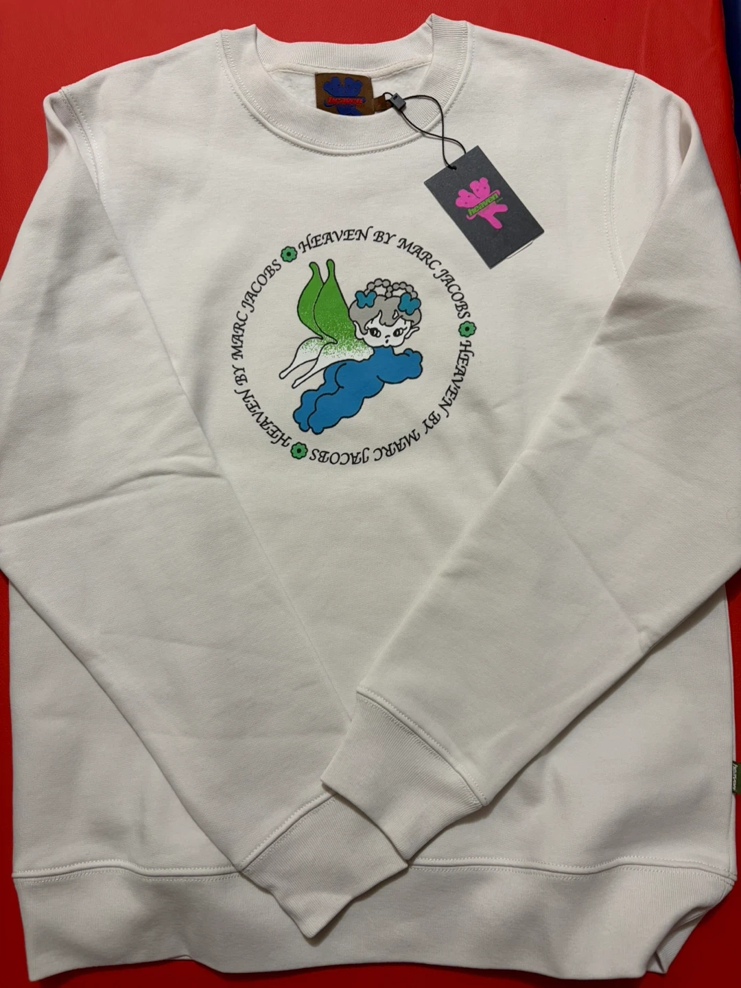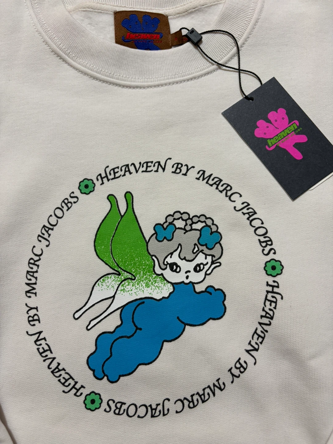 Here's a cool Heaven by Marc Jacobs sweatshirt! It's a stylish piece with a unique design on the front and the word "DYSTOPIA" on the back. Perfect for adding a bit of flair to your wardrobe