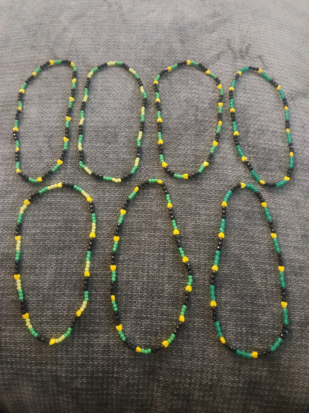 Selling handmade Rasta-coloured beaded necklaces! Only 8 left in stock. They feature the iconic green, yellow, and black beads. Perfect for adding a pop of colour to your outfit or for a Rasta-themed event!