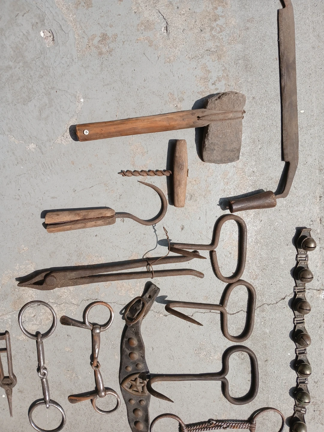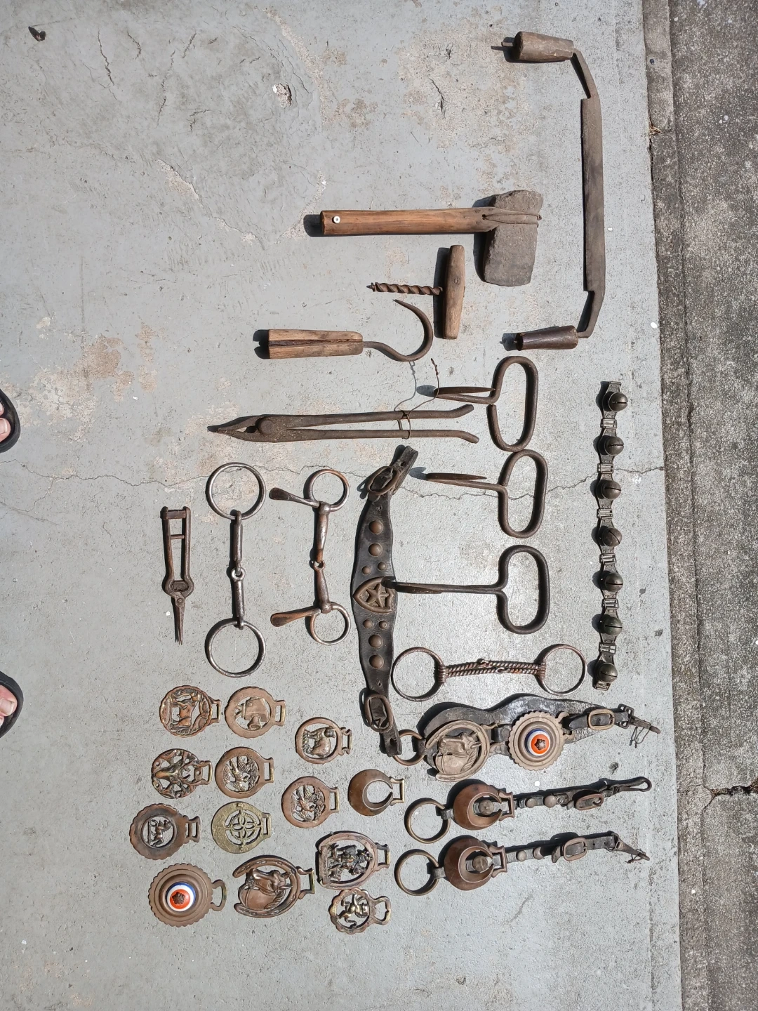 Selling a collection of antique horse tack. Includes various bits, buckles, and tools. Great for collectors or those interested in equestrian history. Condition is used, with signs of age and wear, as expected for antique items