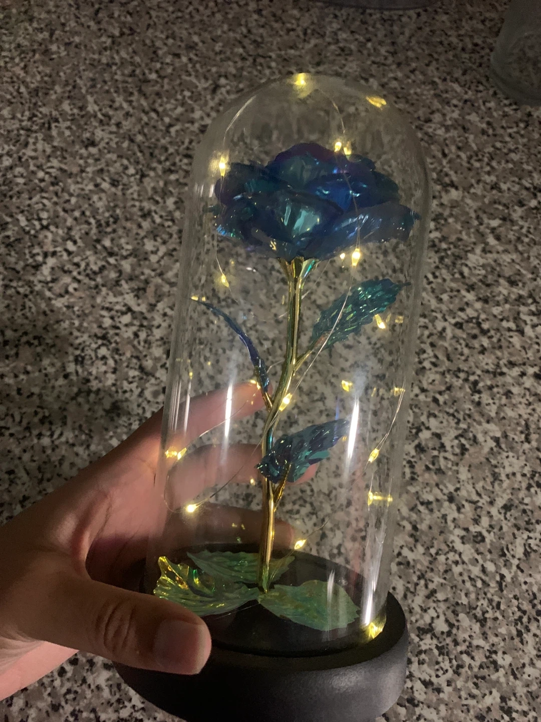 Add a touch of magic to your space with this beautiful enchanted rose! It's encased in a dome and illuminated with delicate LED lights, creating a warm and inviting glow. Perfect as a night light or a decorative piece for any room in your home