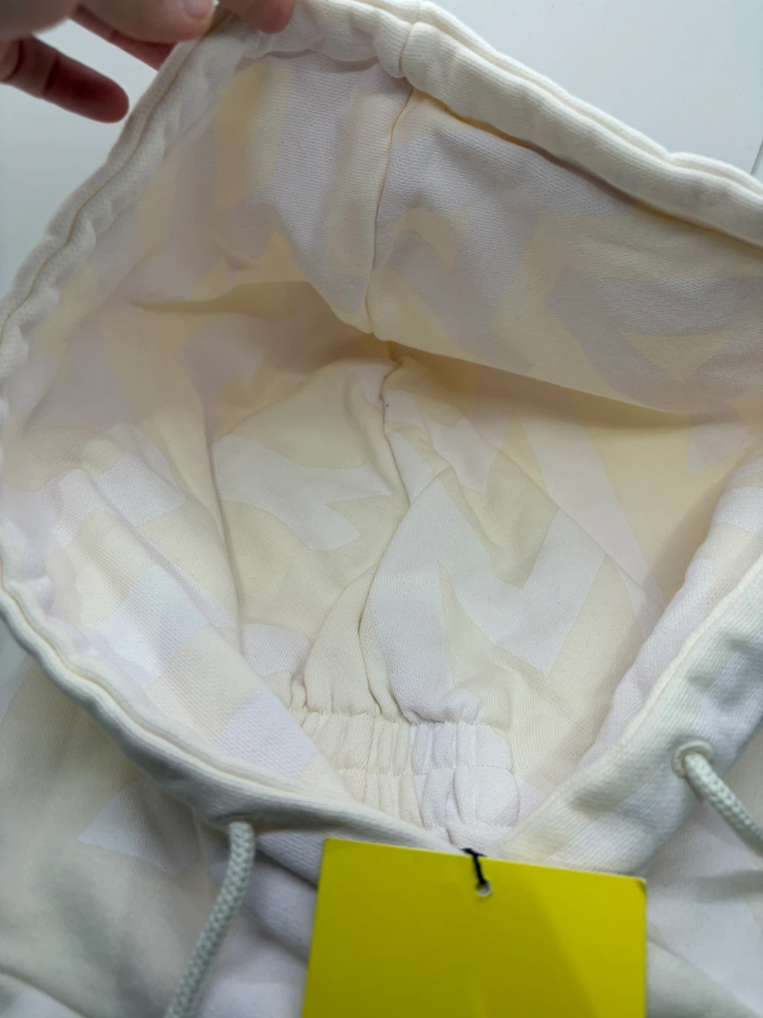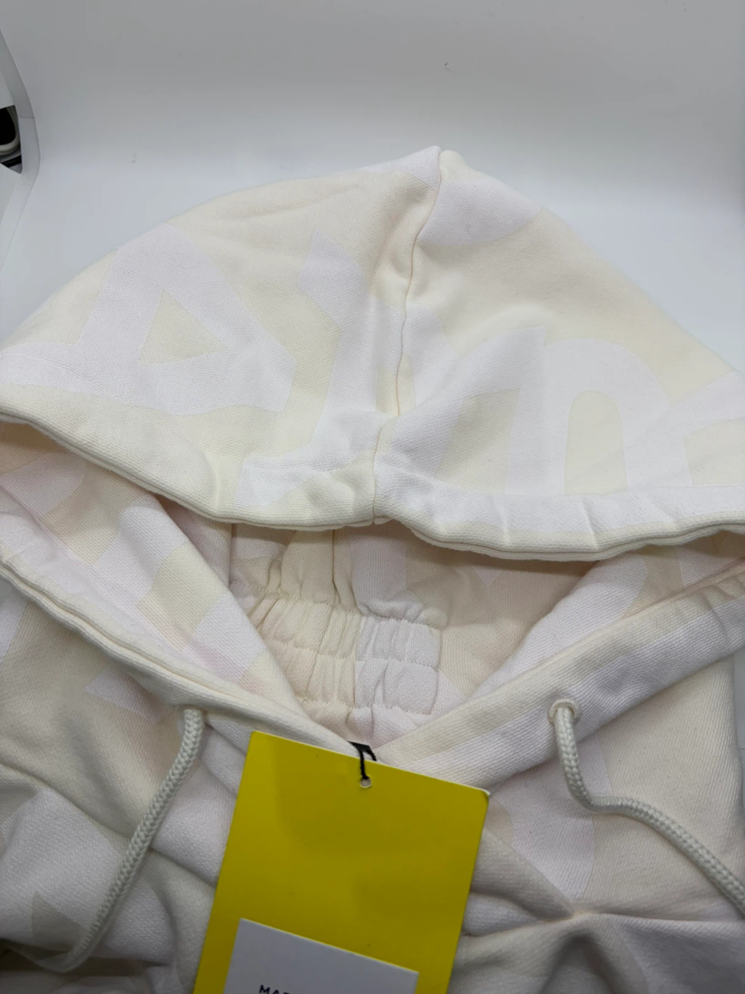 Selling a brand new Marc Jacobs hoodie. It's a cream color and features the Marc Jacobs logo pattern throughout. Perfect for a cozy and stylish look!