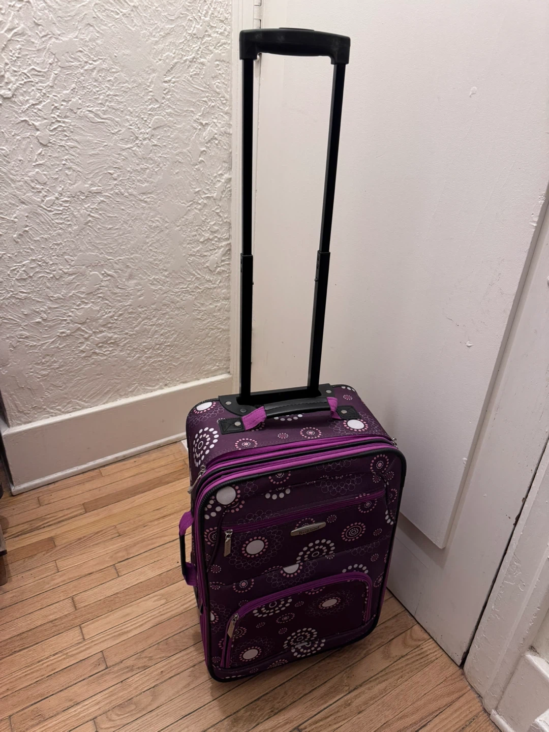 Moving Rockland Purple Carry-On Suitcase light weight 20” Airline approved with extension and extra pocket all working good