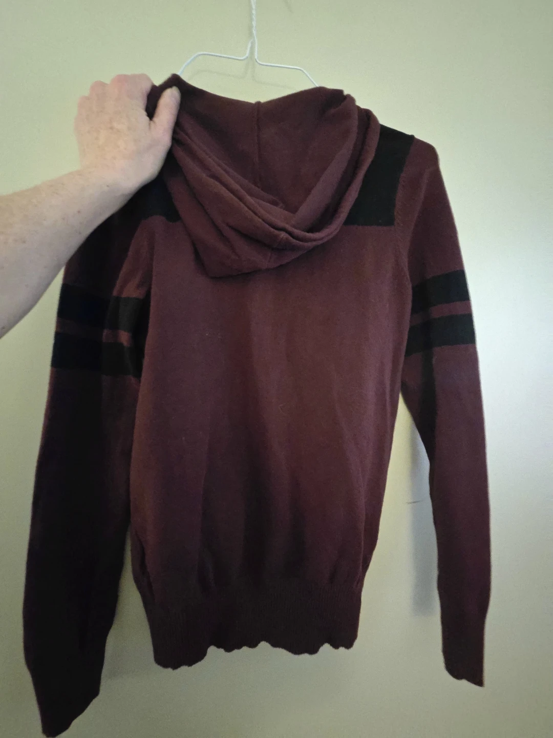 New condition, fits a bit tight (Size Small). Pretty burgundy colour! Very soft & comfy material.