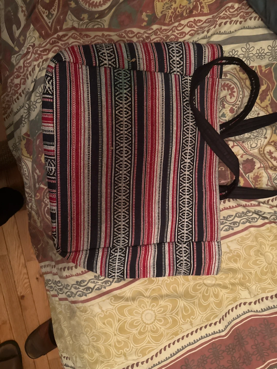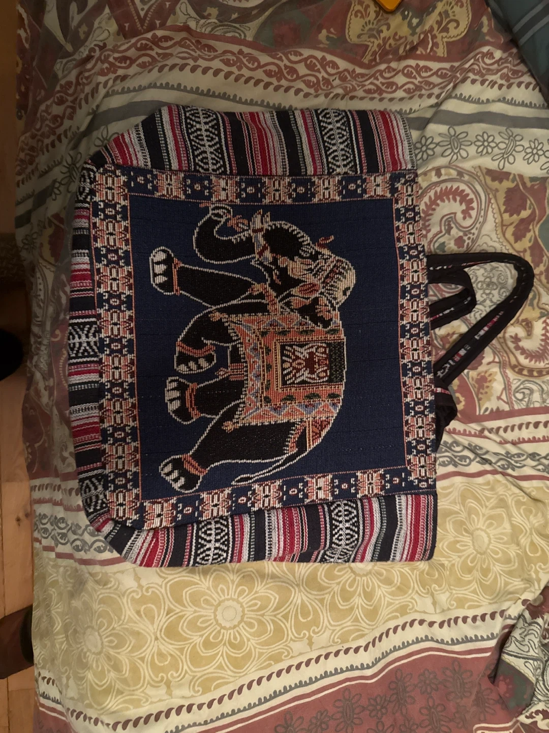 This shoulder bag features a unique elephant design. It has a navy blue center panel with a detailed elephant graphic, surrounded by a patterned border. The bag has a black shoulder strap and a striped pattern on the sides.