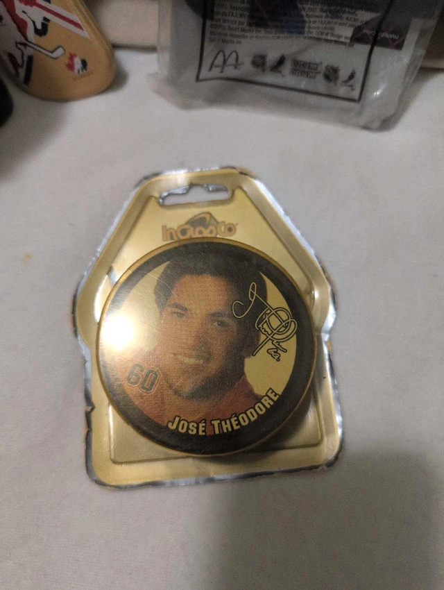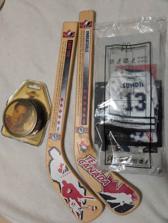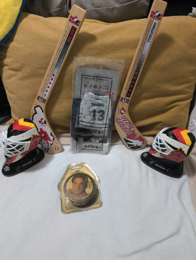 I'm offering a collection of McDonald's hockey collectibles. This nostalgic set includes mini hockey sticks, goalie masks featuring Kirk McLean, Jose Theodore Pogs and a Sundin Jersey. These items are in used condition, showing some wear, but are perfect for any hockey fan looking to add a bit of vintage memorabilia to their collection. Looking to add some vintage flair to your collection? This set has got you covered! Remember, if the ad is up, it's still available!