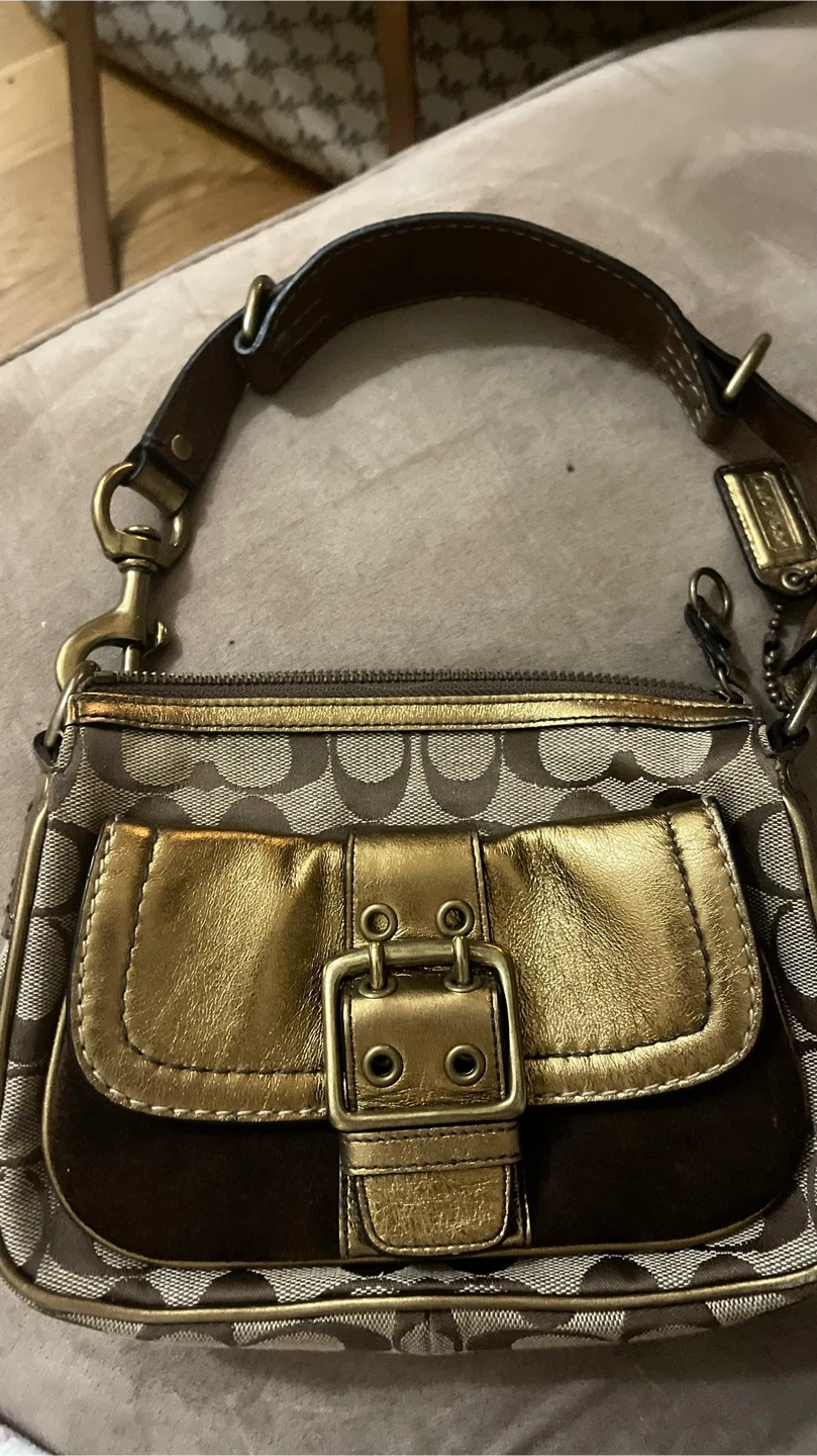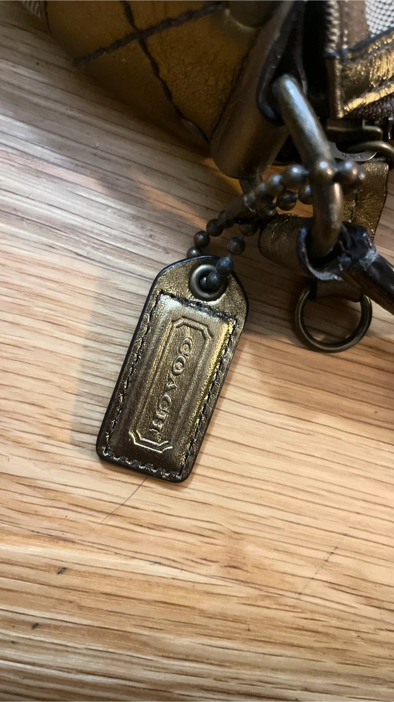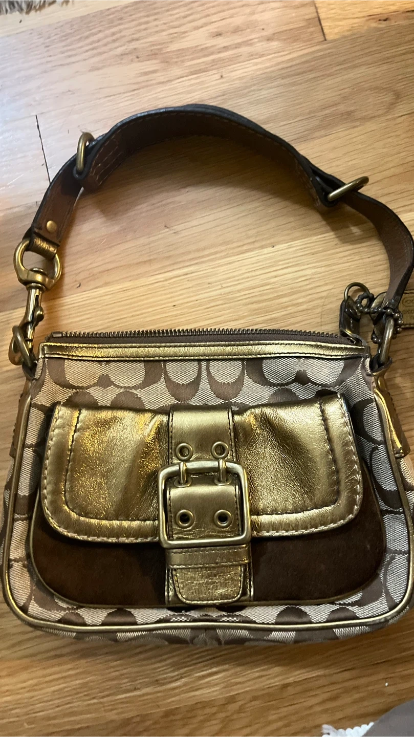 Selling a Coach handbag from the Special Edition Fall 2004 collection! It's a stylish piece with a unique design and classic Coach detailing. The bag features a distinctive pattern and a metallic gold accent.