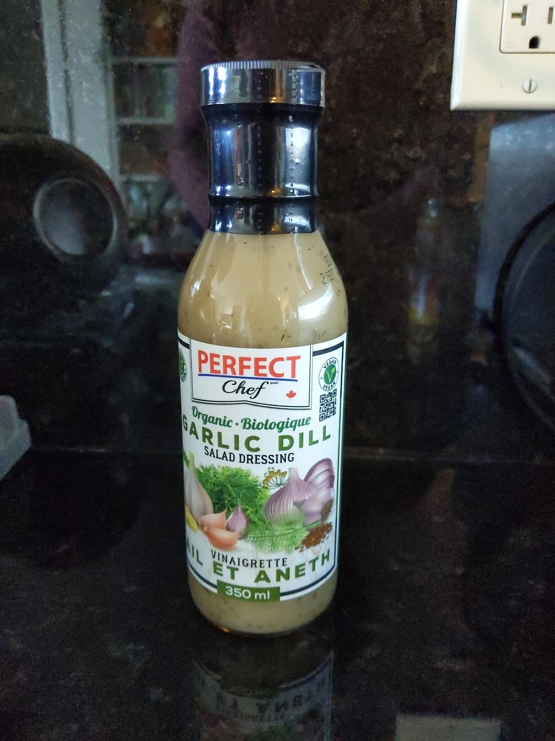 Selling a bottle of Perfect Chef Organic Garlic Dill salad dressing. It's a vinaigrette and comes in a 350ml bottle. The best before date is 2027 August 16.