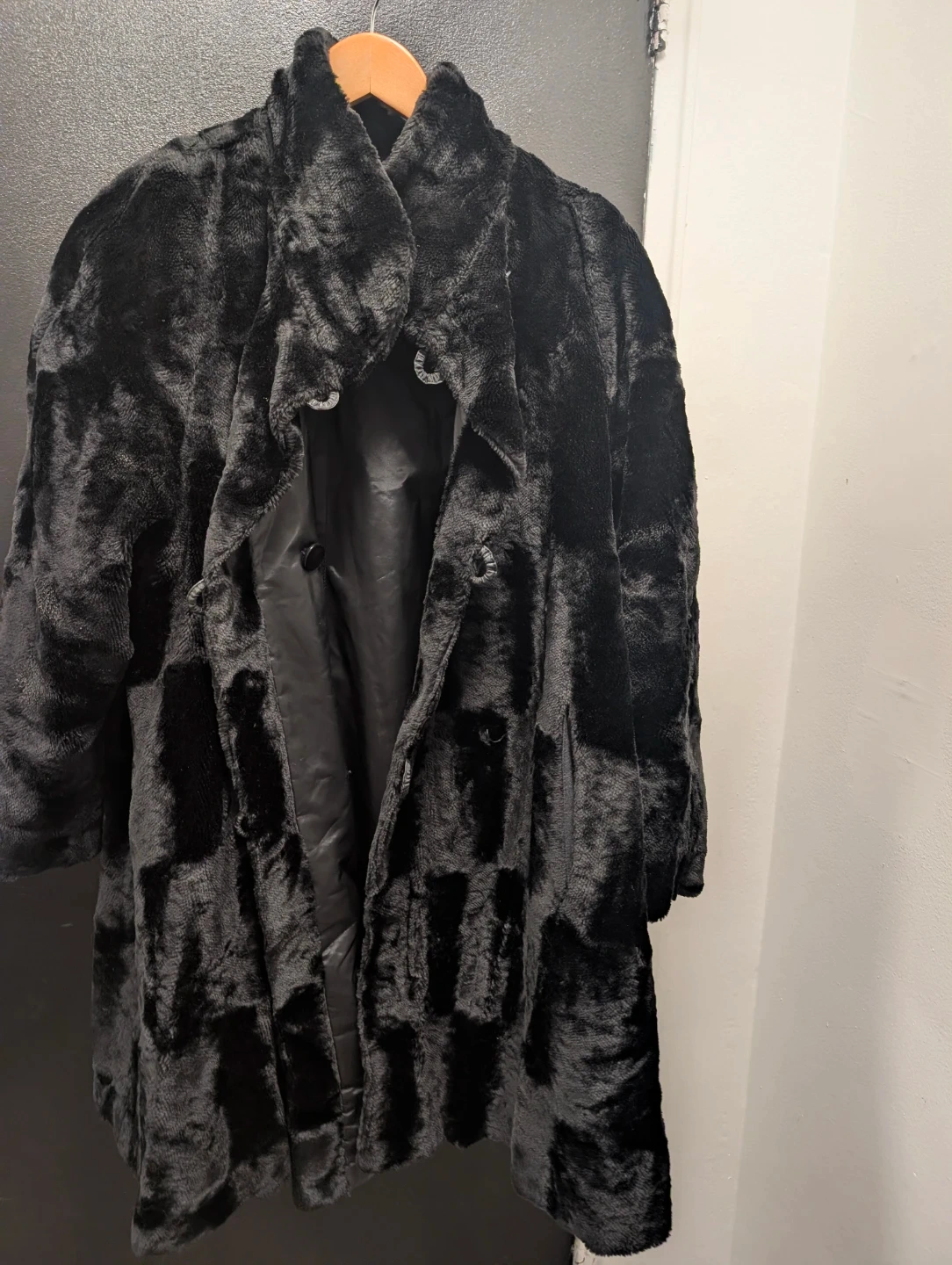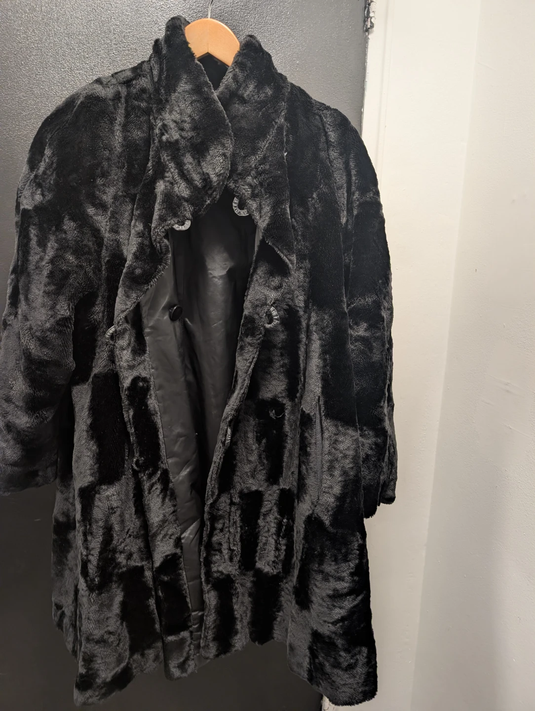 Selling a cozy black faux fur coat. It's in great shape and perfect for staying warm during the colder months!