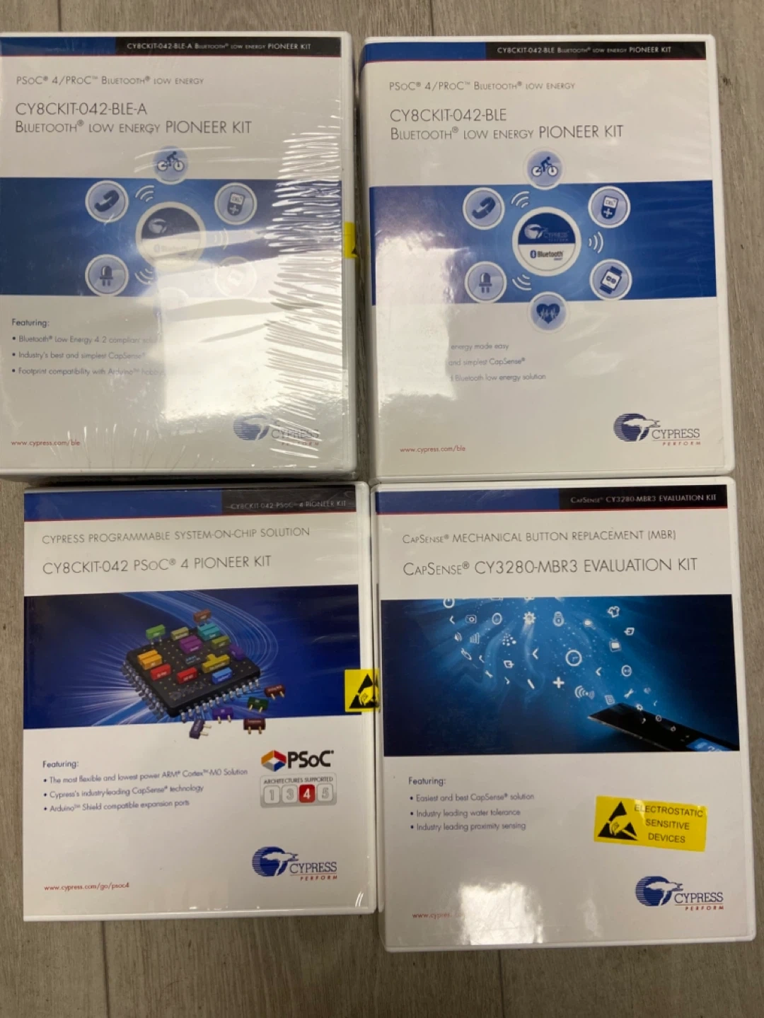 12I have a few Cypress CY8CKIT-042 Pioneer Kits available. These are great for experimenting with Bluetooth Low Energy and CapSense technology. Includes the CY8CKIT-042-BLE-A Bluetooth Low Energy Pioneer Kit and the CY3280-MBR3 Evaluation Kit. Perfect for your next project!