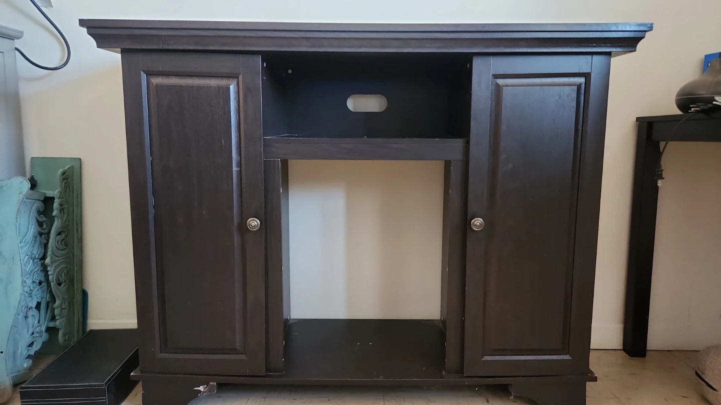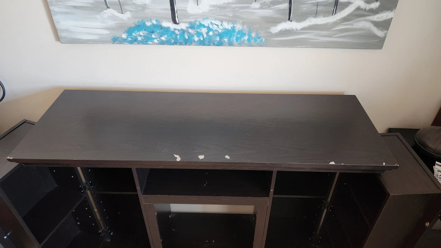 Selling a dark brown TV stand. It has some signs of wear and tear, as shown in the pictures. It's still a functional piece of furniture.