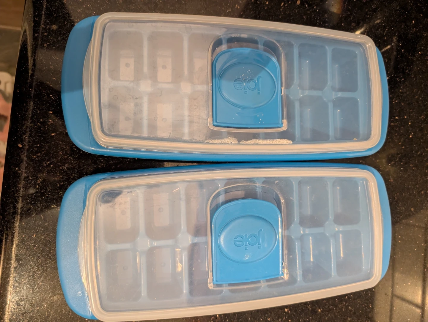 Selling a set of two Joie ice cube trays. They come with lids, so you can stack them easily in your freezer. Great for making ice for drinks or freezing small portions of food!