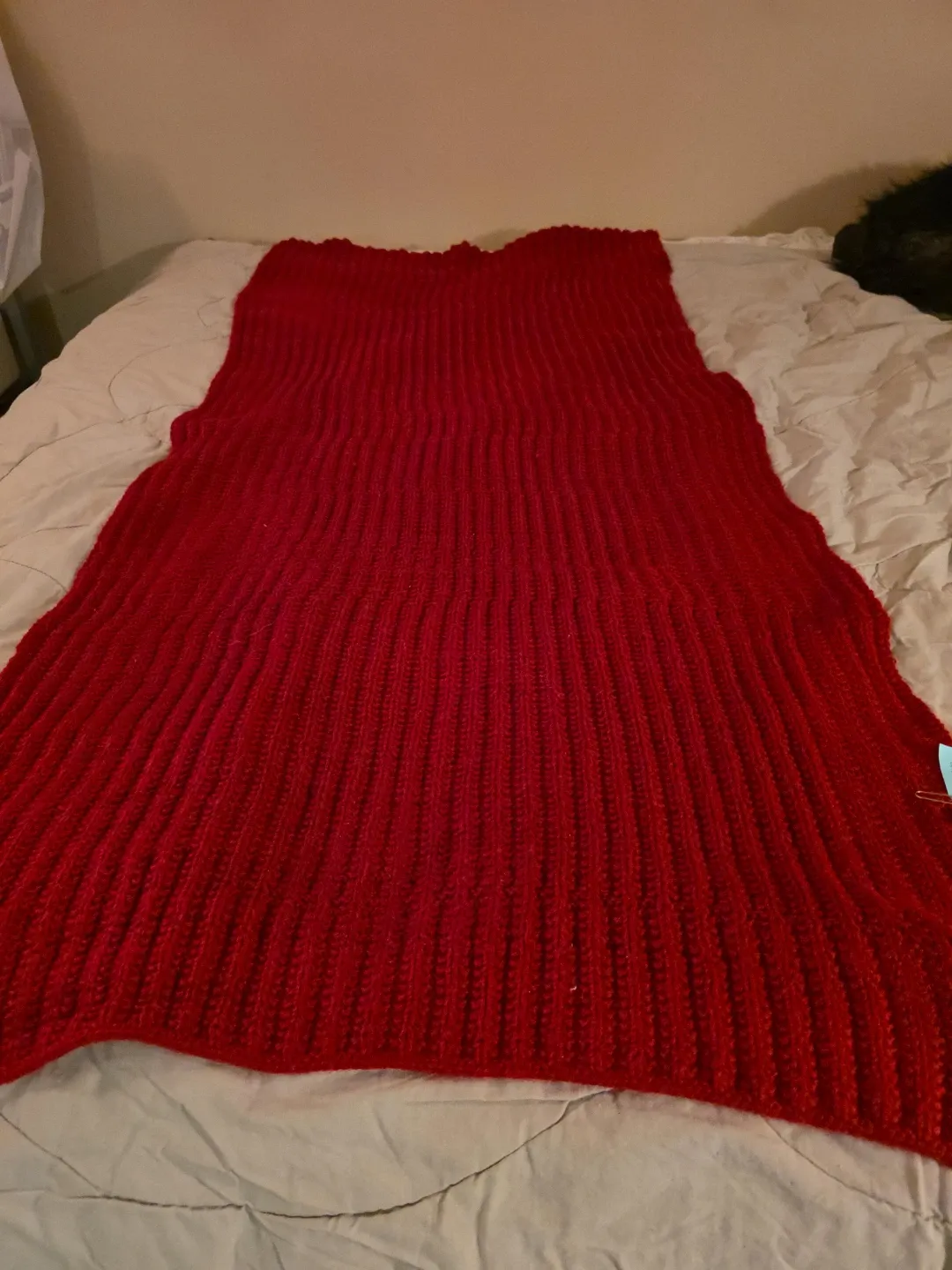 Selling a cozy red knitted throw blanket. It's in great condition and perfect for adding a pop of colour and warmth to your living space. The texture is really nice and it drapes beautifully over a couch or bed!