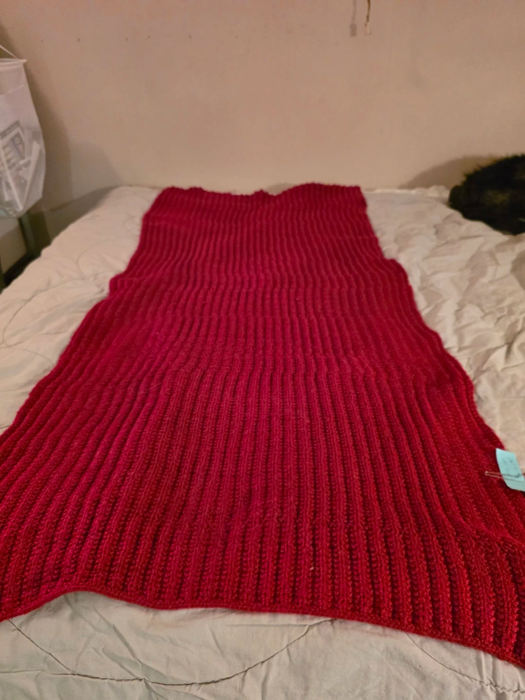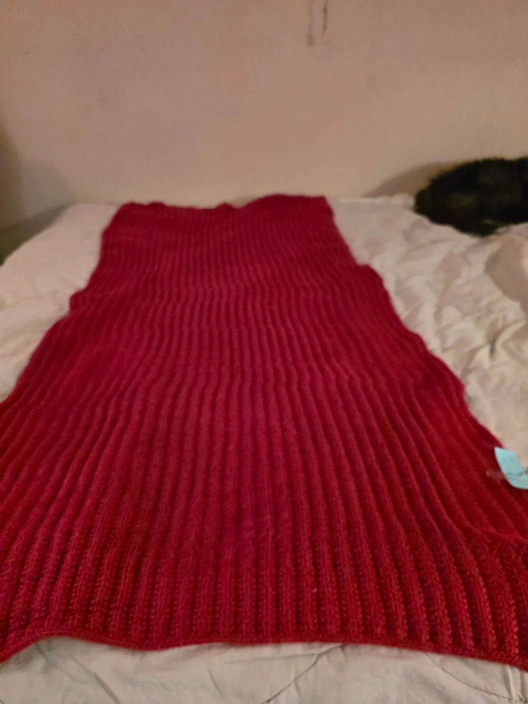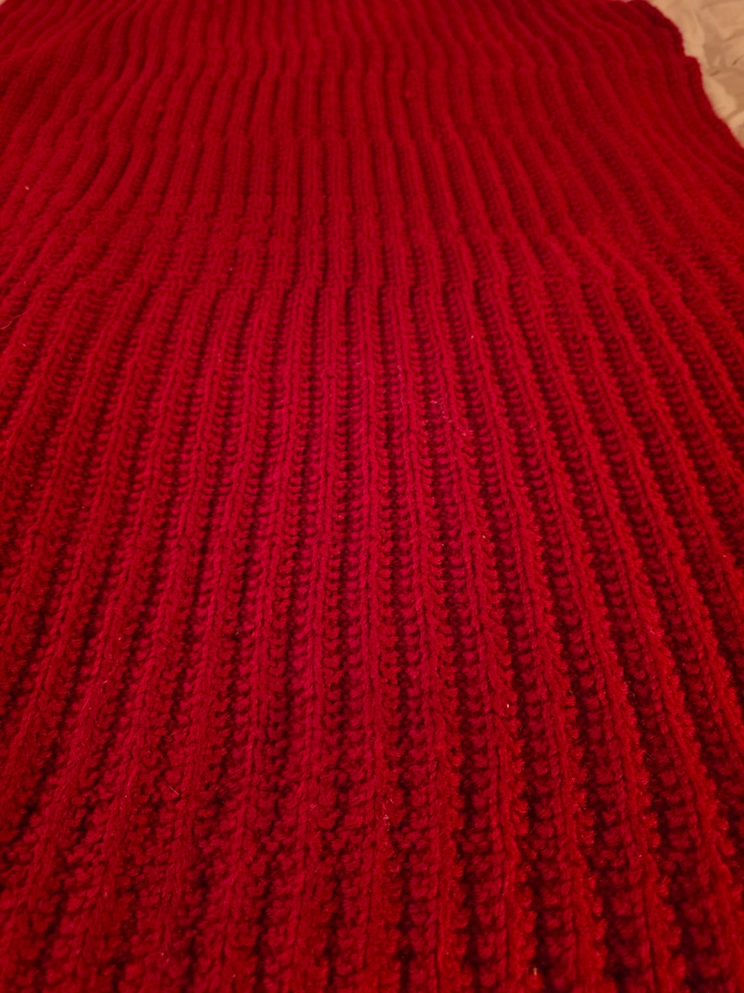 Selling a cozy red knitted throw blanket. It's in great condition and perfect for adding a pop of colour and warmth to your living space. The texture is really nice and it drapes beautifully over a couch or bed!