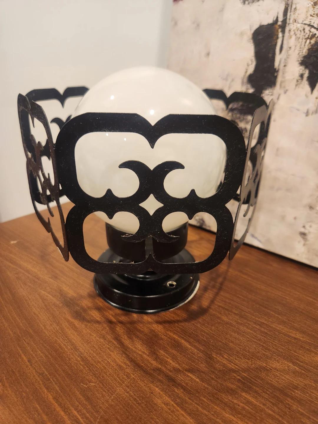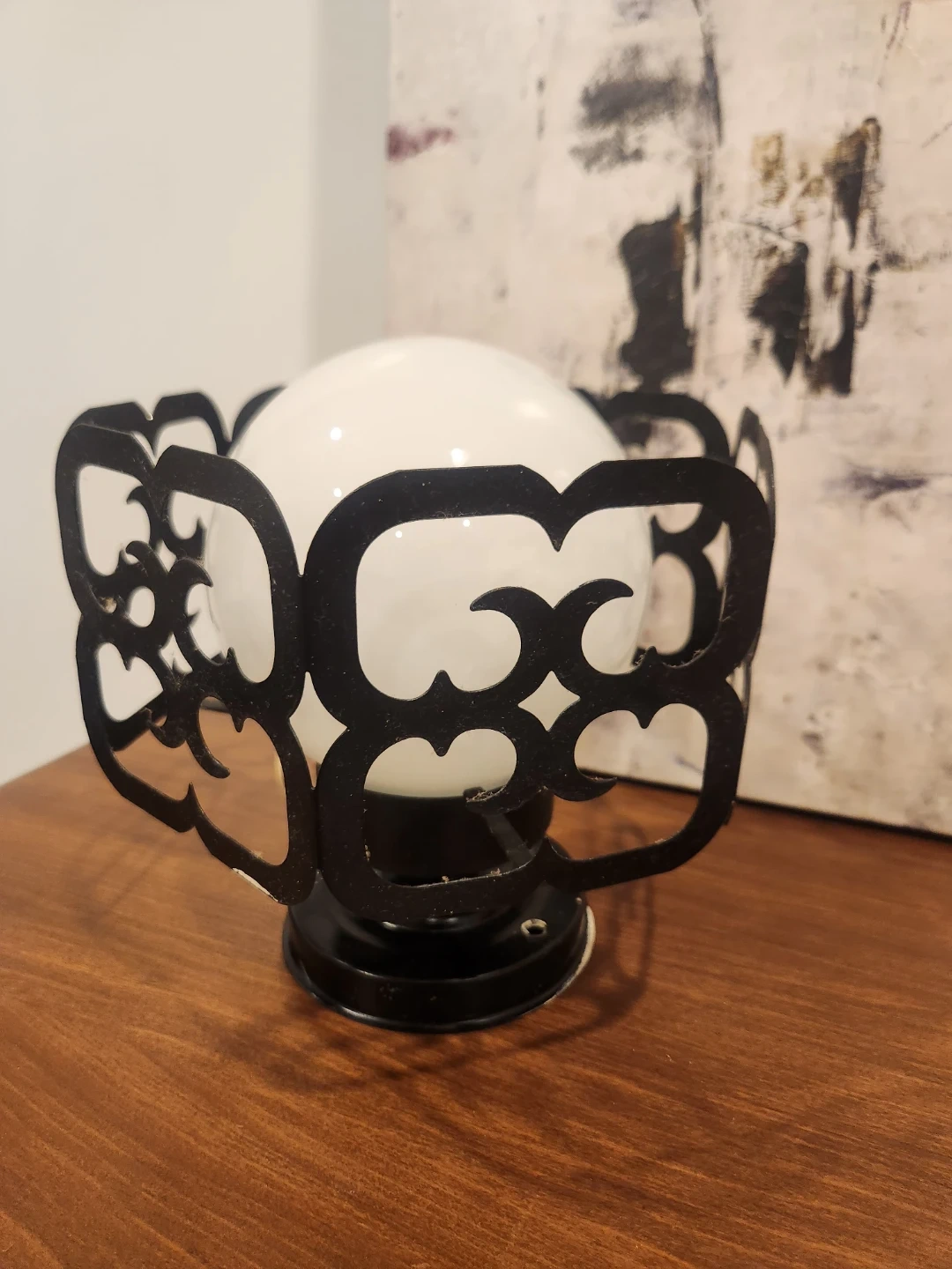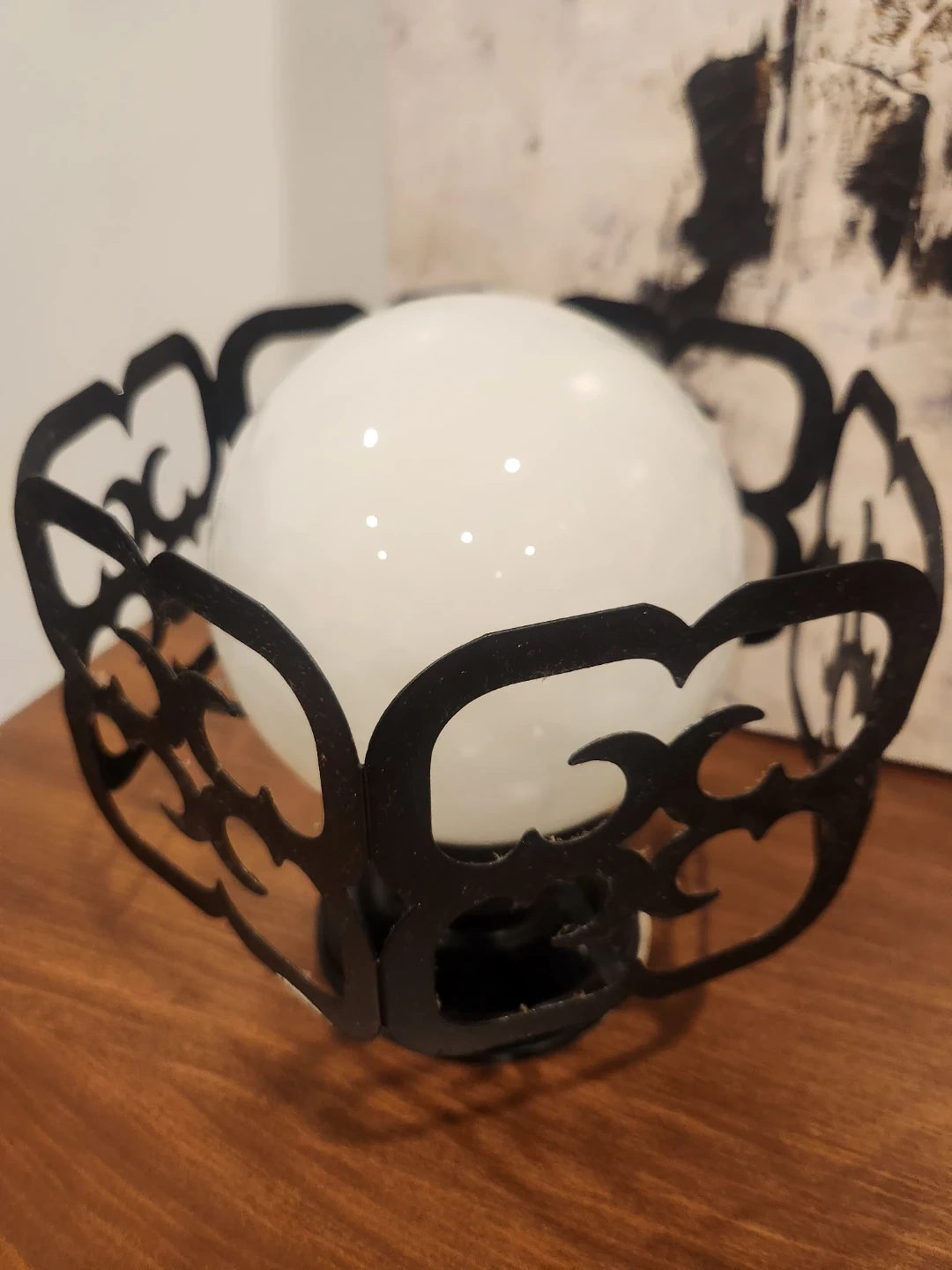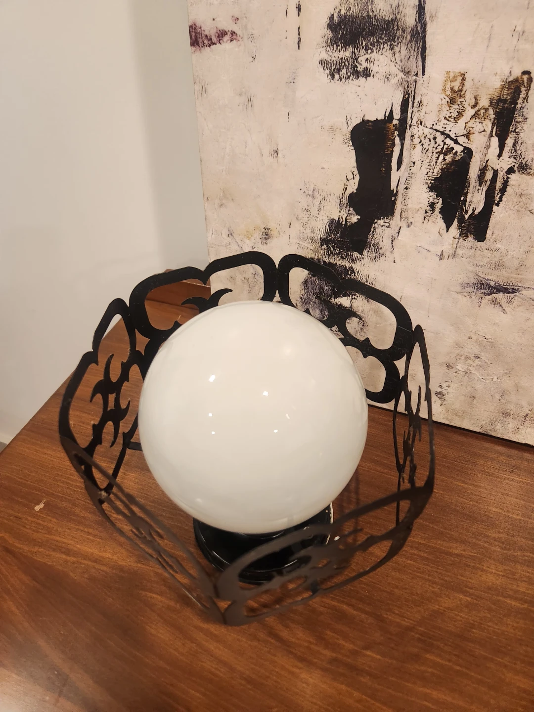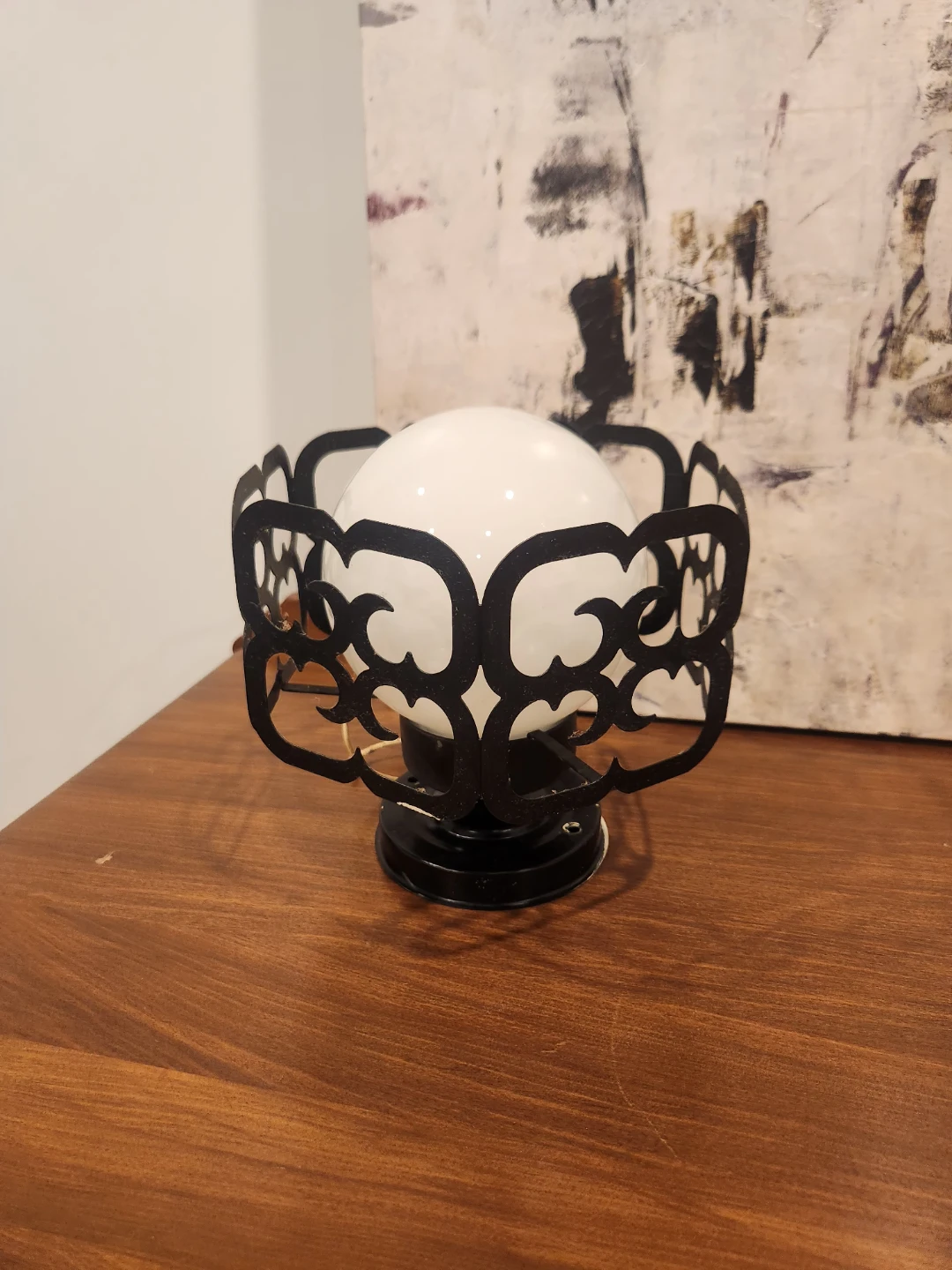 Selling a unique decorative lamp! It features a white glass globe nestled within a stylish black metal frame. It would be a great addition to any room!