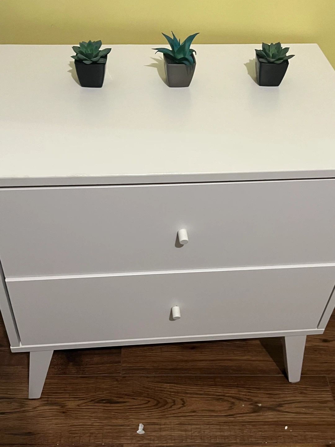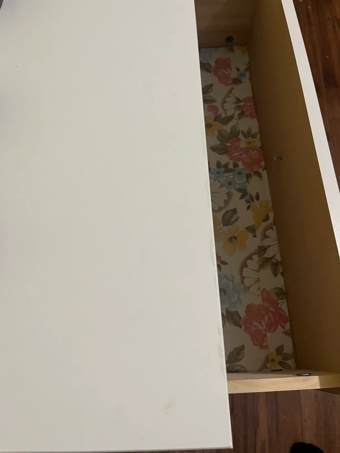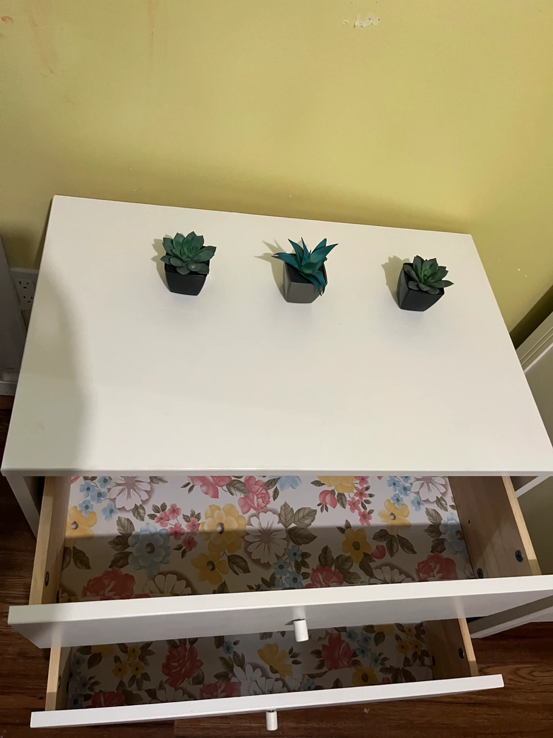Here's a cute white dresser with two drawers! The inside of the drawers are lined with floral wallpaper. It's perfect for a bedroom or small space for extra storage.