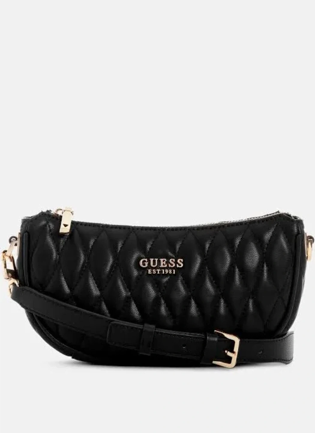 This is a stylish black baguette bag from Guess. It features a quilted design and a sleek, compact shape, perfect for carrying your essentials. The bag has a shoulder strap and gold-tone hardware. Got it as a gift from a friend but i dont use bags so wanted to give it away .