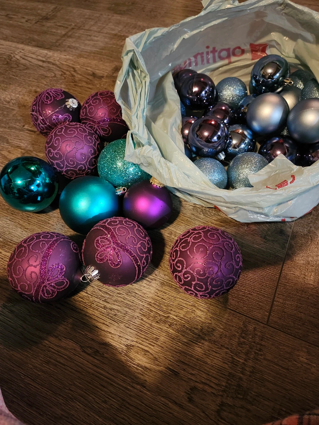 Selling a collection of Christmas tree ornaments in assorted colours including purple, teal, and silver! They're in great condition and ready to add some sparkle to your tree this holiday season