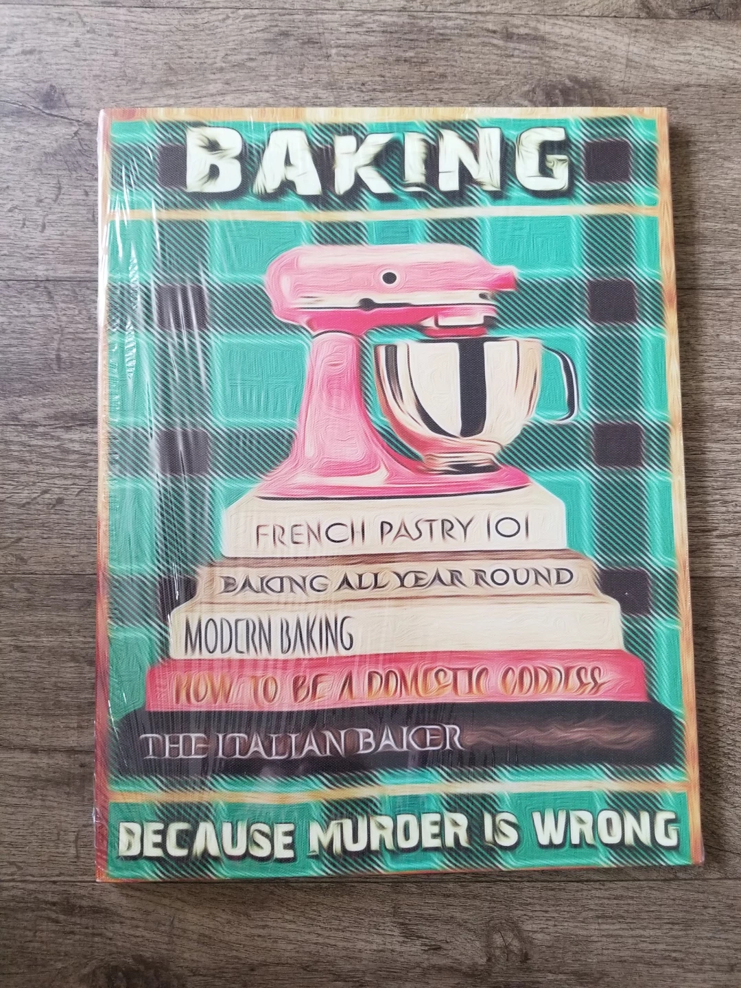240The sign features a pink mixer on top of several books about baking. The background has a plaid design. You could hang this in your kitchen to create a cozy atmosphere. Brand new 15x11