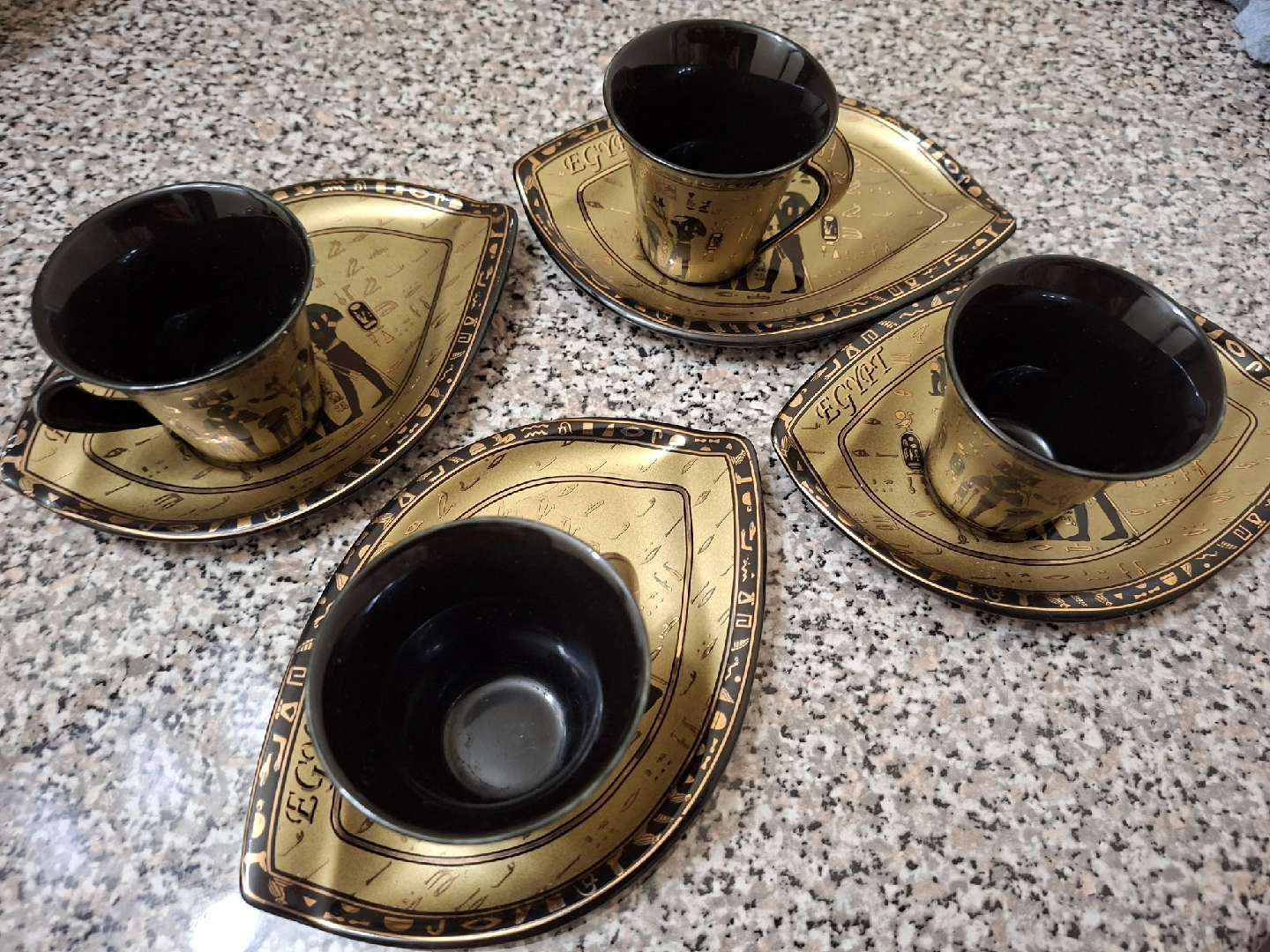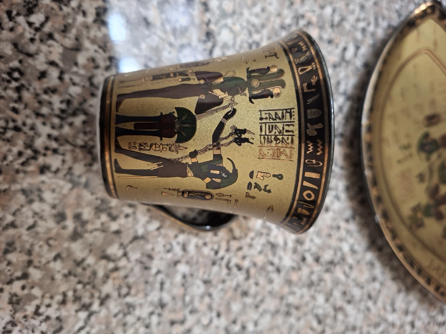 Selling a unique small cup and saucers made by Fathi Mahmoud in Egypt. It features a beautiful Limoges design with hieroglyphics and Egyptian figures. A great piece for collectors or anyone who appreciates unique art!
