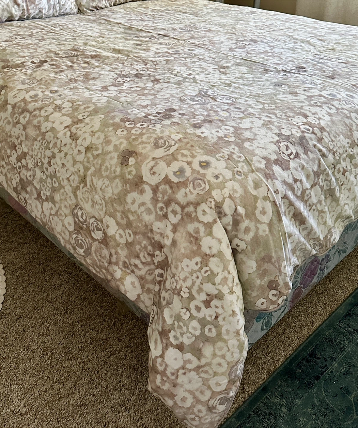 Soft, floral print. Neutral floral colours. Back side is a solid light gray colour. Pre-owned. Hidden zipper. Needs ironing in places due to fold lines. Perfect condition.