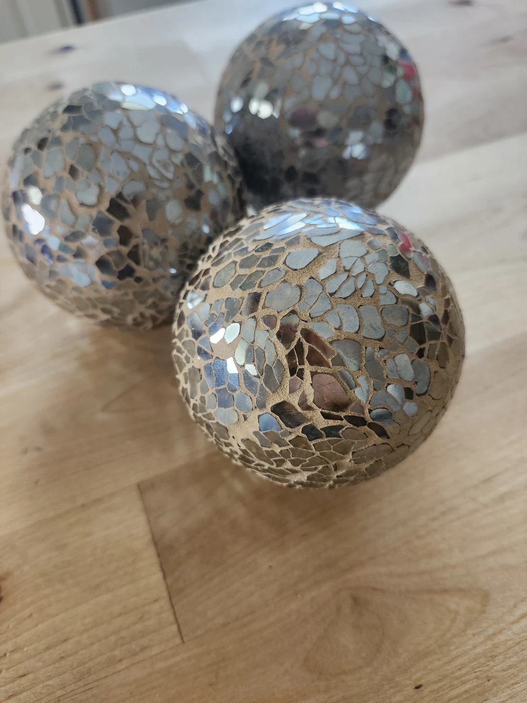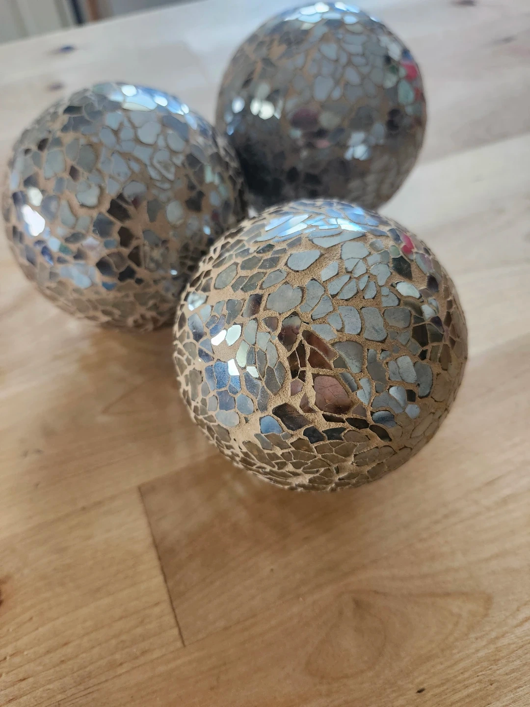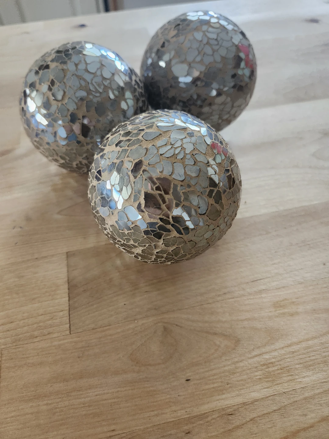 Selling a set of three gold mosaic decorative spheres! They add a touch of sparkle and texture to any room. Perfect for adding a unique accent to your home decor