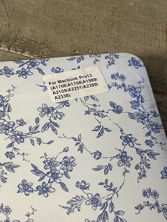 122Keep your MacBook Pro 13" protected and stylish with this new hard case featuring a delightful blue floral design! It fits models A1706, A1708, A1989, A2159, A2251, A2289, and A2338, adding a touch of elegance while guarding against scratches and dings. Specifications: * Designed for: MacBook Pro 13-inch * Compatibility: Models A1706, A1708, A1989, A2159, A2251, A2289, A2338 * Material: Hard plastic * Design: Blue floral pattern * Condition: New If the ad's up, it's up for grabs! Pickup is in Brampton near Sheridan College