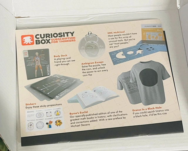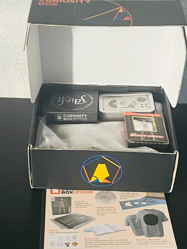 122Get ready to unlock your inner genius with this captivating Curiosity Box! This collection is in excellent condition and includes mind-bending puzzles, games, and unique items that are sure to challenge and entertain. Included: - Curiosity Magazine - Ambigram Escape Puzzle - EDC Multitool - The Body Deck playing cards - Various stickers and sticky presentations Unleash your curiosity and dive into a world of discovery. While I can't guarantee this box will turn you into the next Einstein, it's definitely a fun way to spend an afternoon! If the ad is up, the box is available! Pick up is in Brampton near Sheridan College.