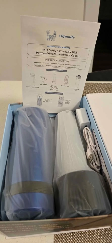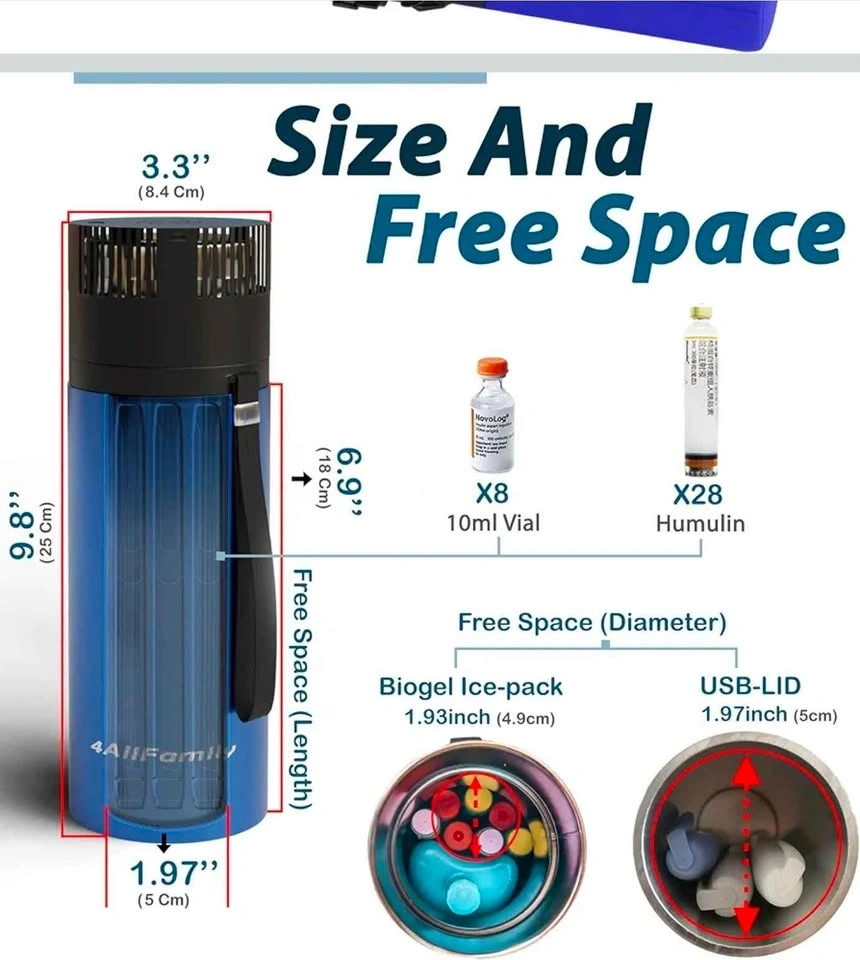 4ALLFAMILY Voyager AUTO Shut Off USB TSA Medication Cooler Travel Case Keeps Fridge Temp 36F-46F + Biogel Ice Pack |Perfect Medical Cooler Diabetes Insulin Eye Drop Arthritis (Blue