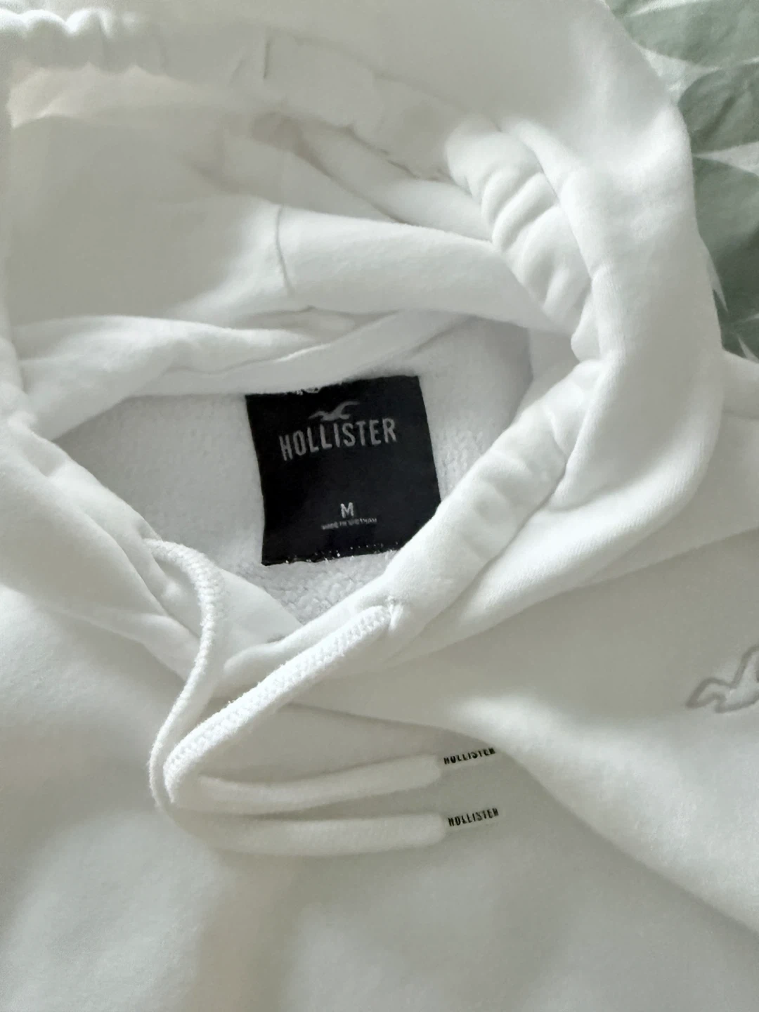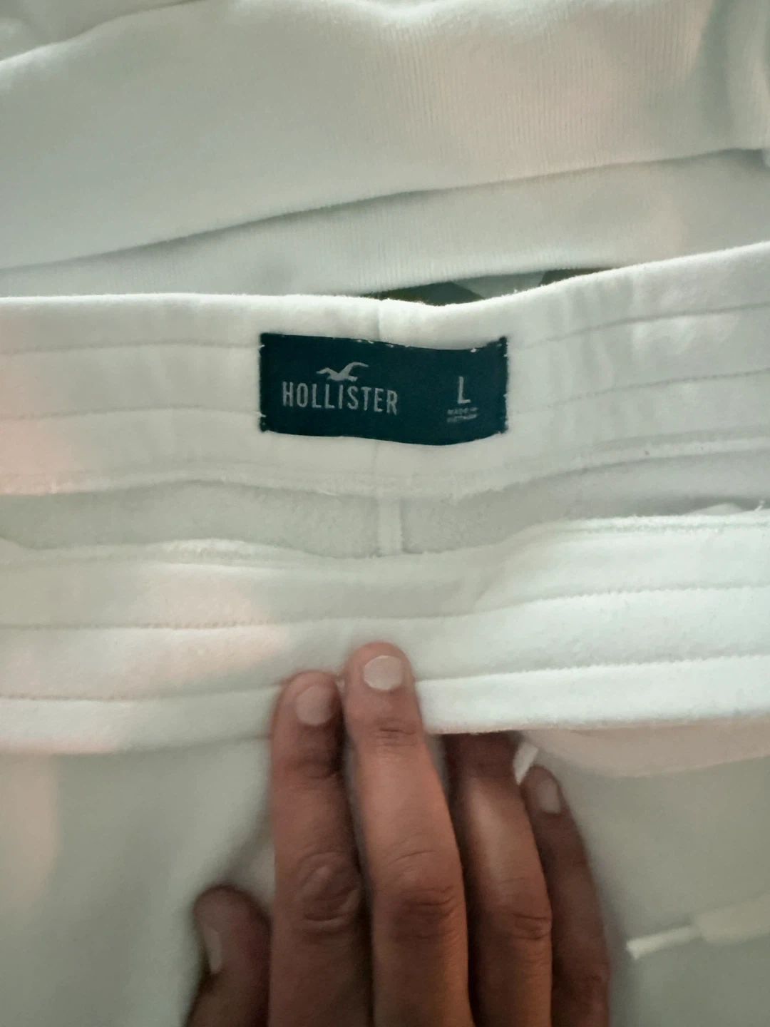 Selling a matching Hollister set! The hoodie is a size medium and the sweatpants are a size large. Both are in great condition and are a crisp, clean white. Perfect for lounging or running errands!