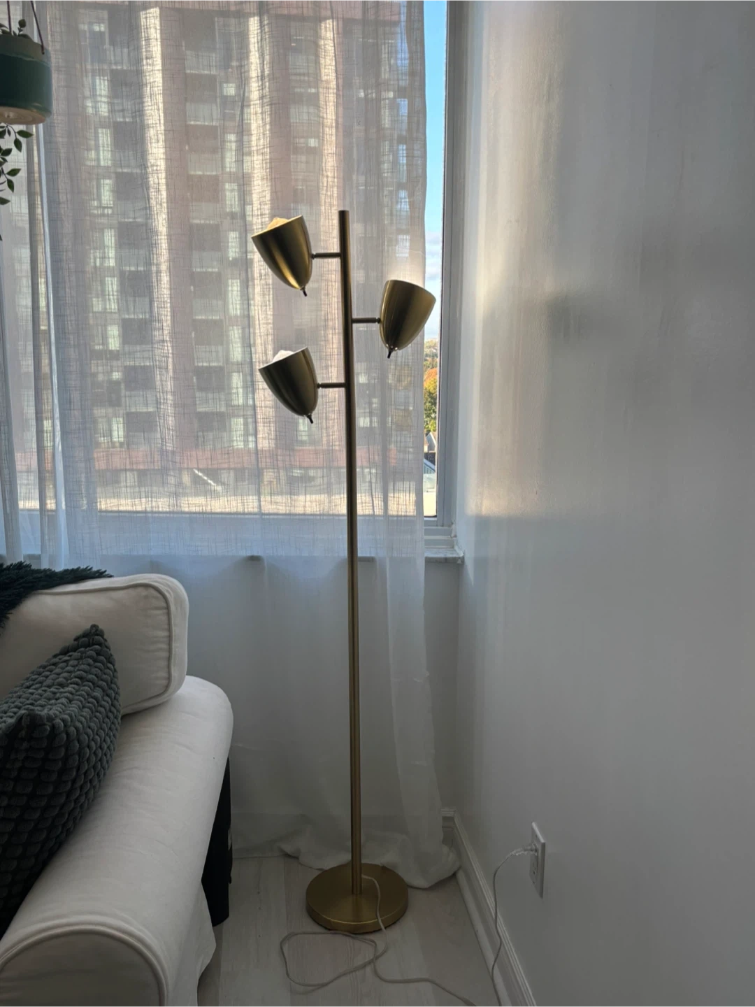 Selling a stylish floor lamp with a gold finish! It features three adjustable lights, perfect for adding a touch of modern elegance to any room. It's in great condition and ready to brighten up your space