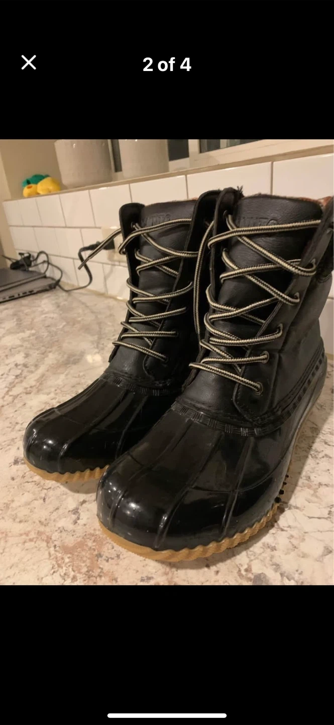 Buy & SellBlack Duck BootsBlack Duck Boots$29Selling a pair of Wanted black duck boots. They have a lace-up design and a rubber sole, perfect for wet weather!ConditionNewSize81 chats·0 favorites·17 viewsSELLERJulieWaverley100 reviewsWHERE TO MEETCheck Location