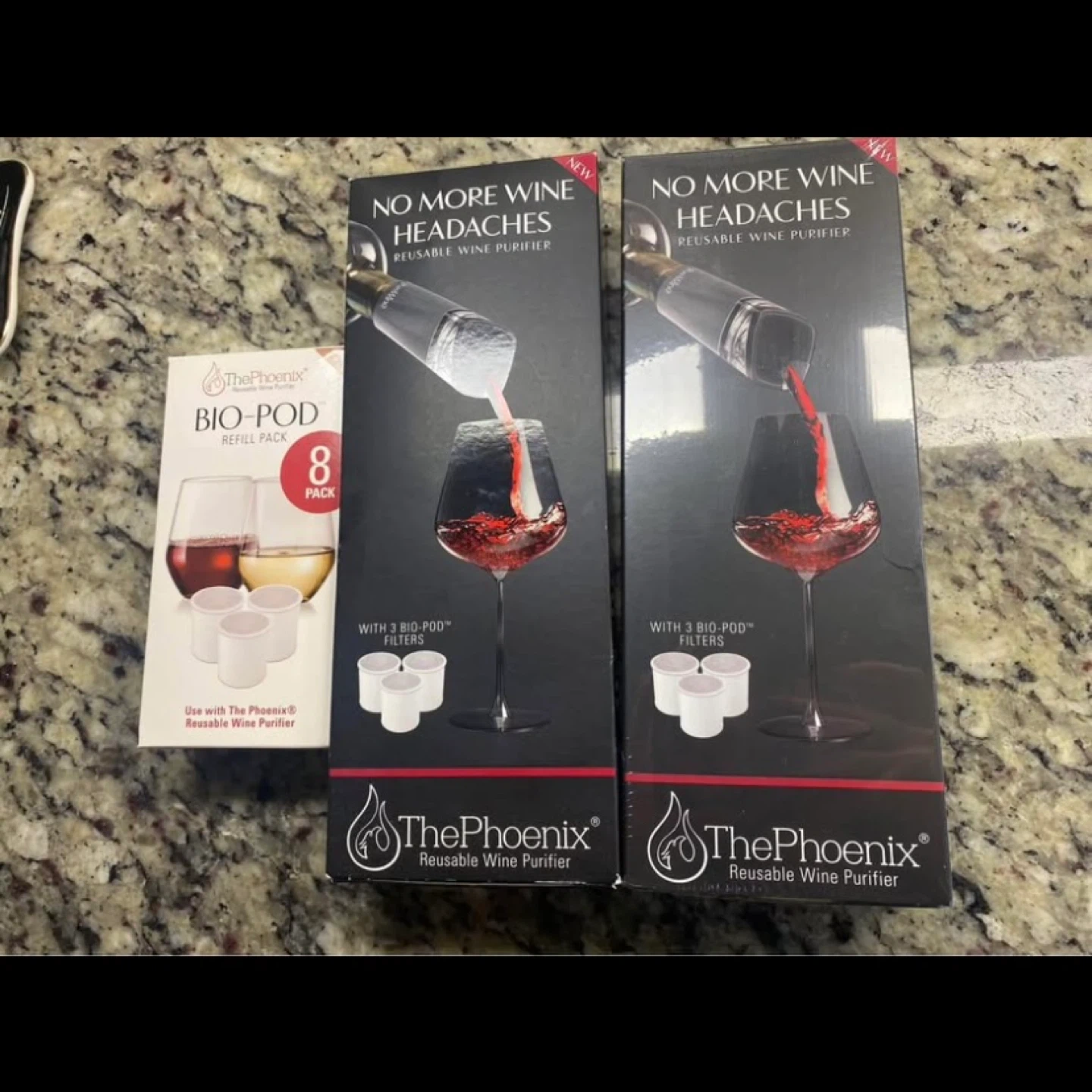 Selling The Phoenix reusable wine purifier, designed to eliminate wine headaches! It comes with 3 Bio-Pod filters. Also included is an 8-pack of Bio-Pod refill filters to keep your wine tasting great