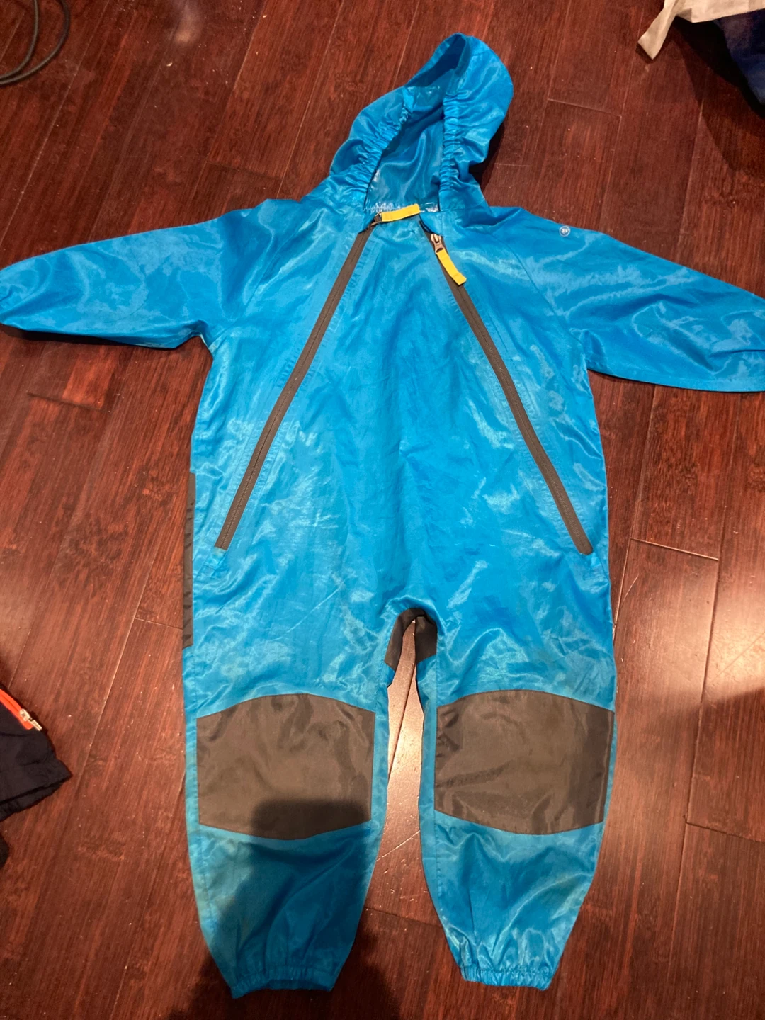 Selling a blue rain suit. It has a hood and a zipper down the front. Perfect for keeping little ones dry on rainy days!