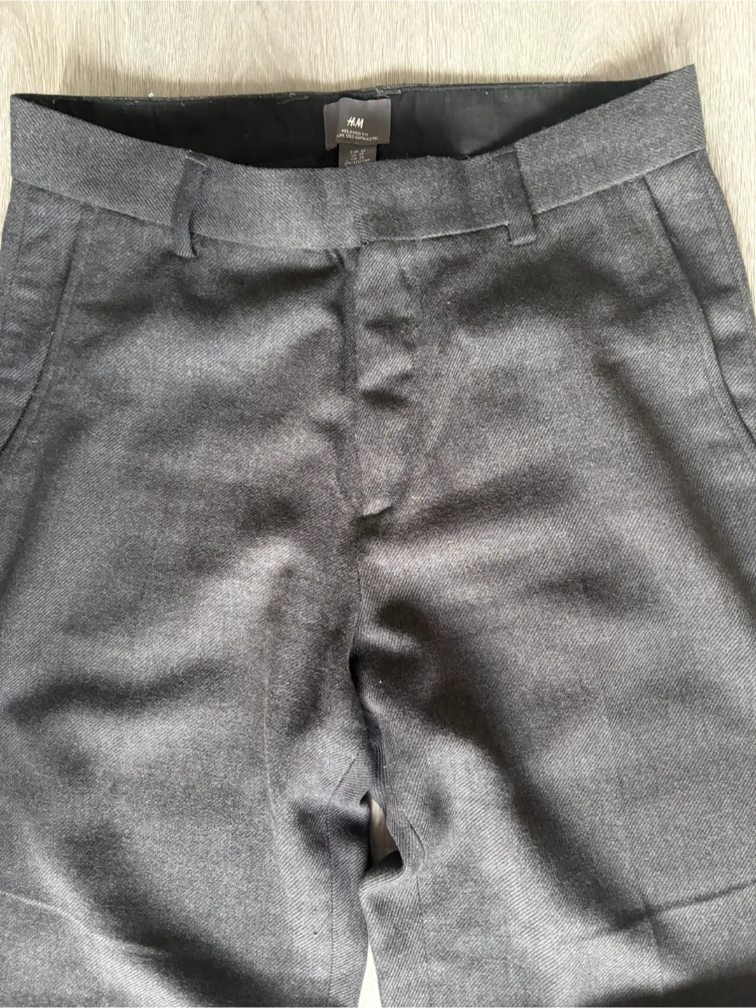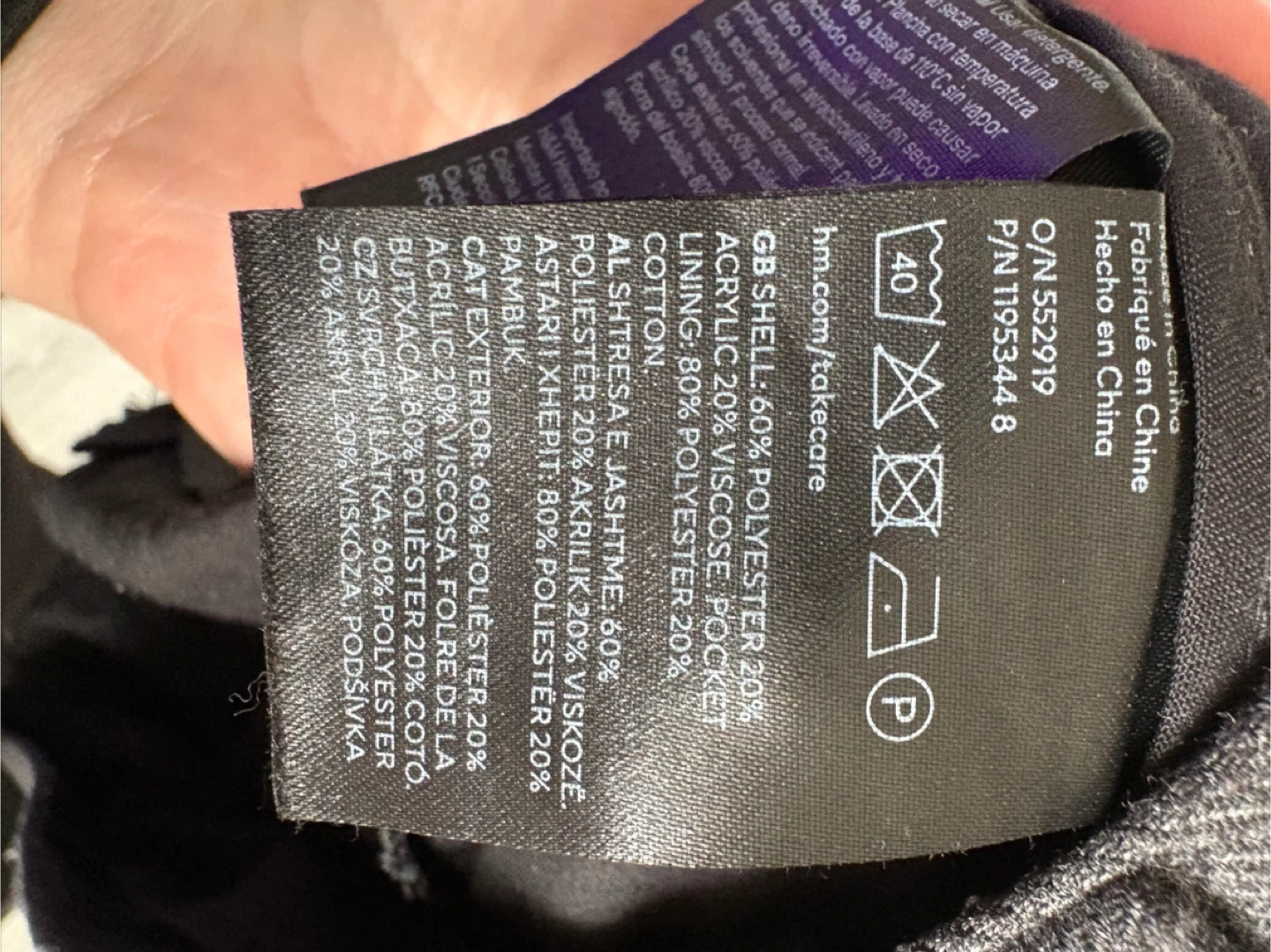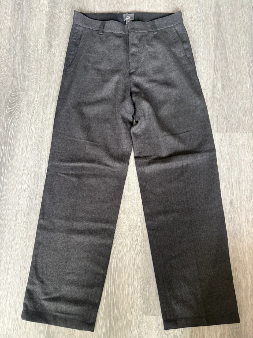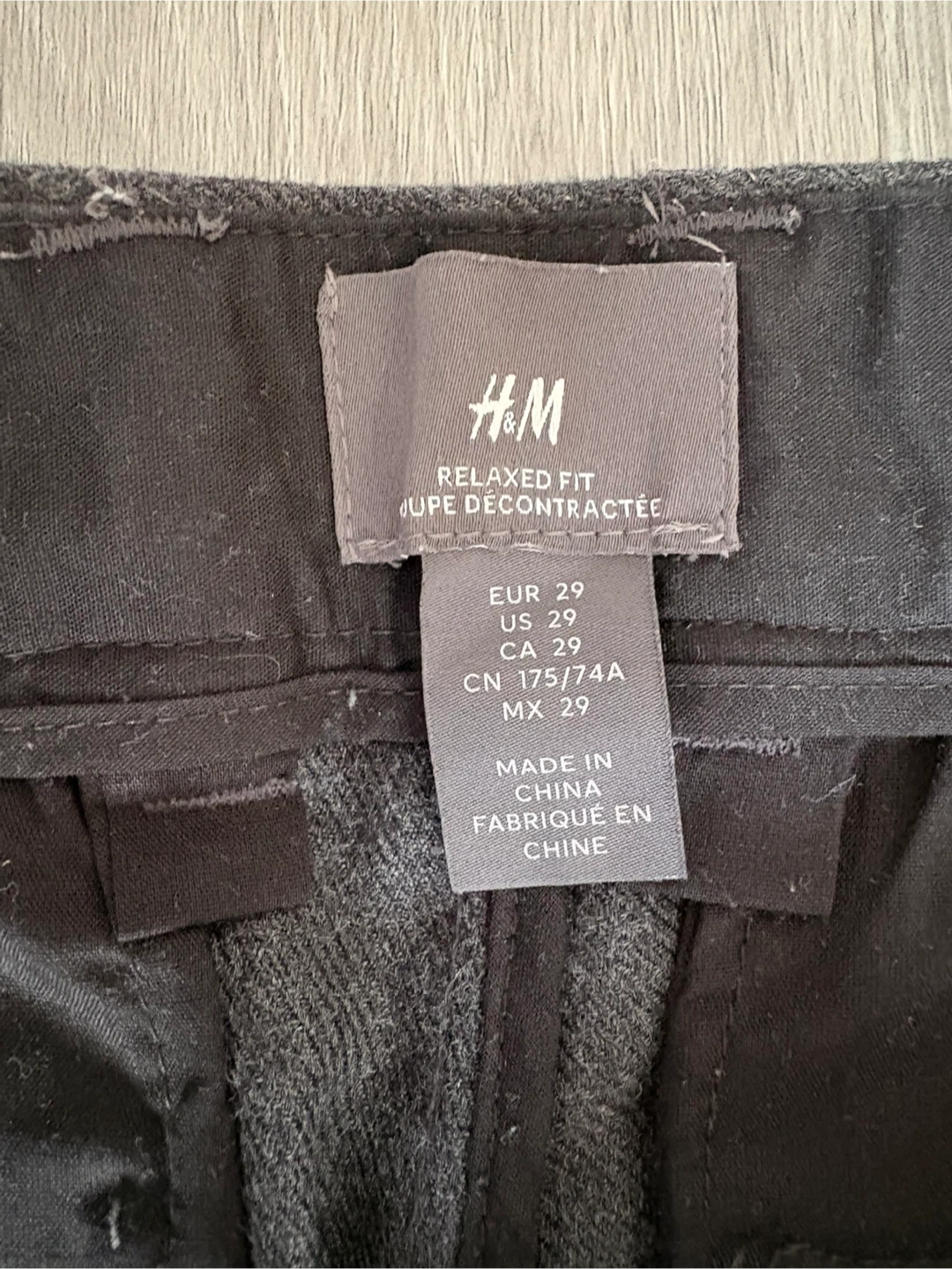 Selling a pair of H&M relaxed fit trousers in a dark grey colour. The size is EUR 29. The shell is 60% polyester and 20% viscose and 20% acrylic. The lining is 80% polyester and 20% cotton. They're in great shape and ready for a new home!