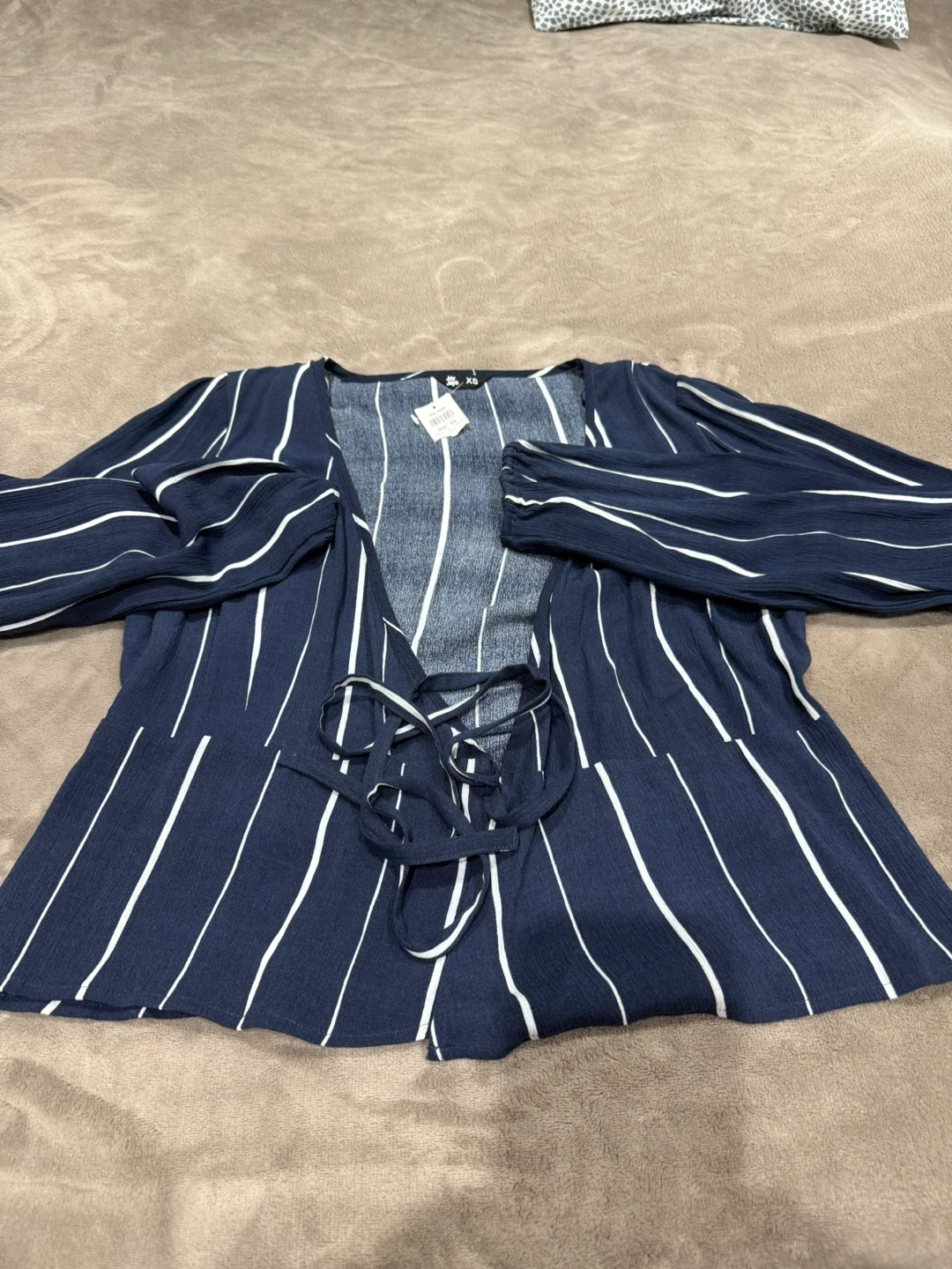 Cute navy and white striped wrap top in size extra small! Perfect for layering or wearing on its own. It's in great condition and ready for a new home! Pickup location is Yonge and Steeles! Cash only