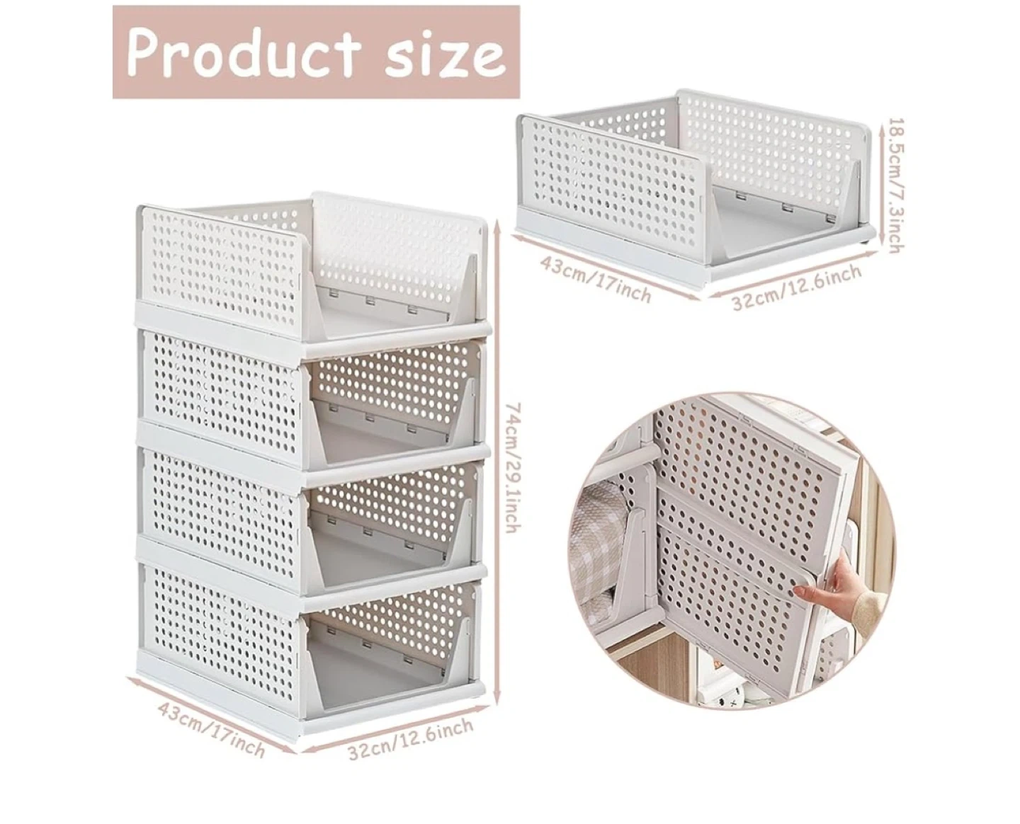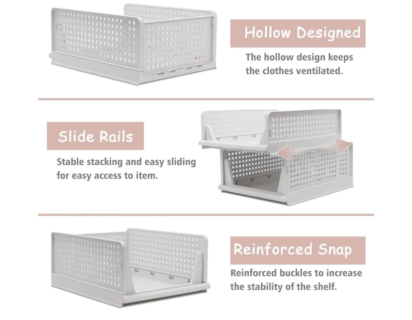 Declutter your space with these stackable closet organizer baskets! They're white and measure approximately 17 inches wide, 12.6 inches deep, and 7.3 inches high. The hollow design keeps your clothes ventilated, and the slide rails make accessing items easy. Plus, the reinforced snaps increase the stability of the shelf