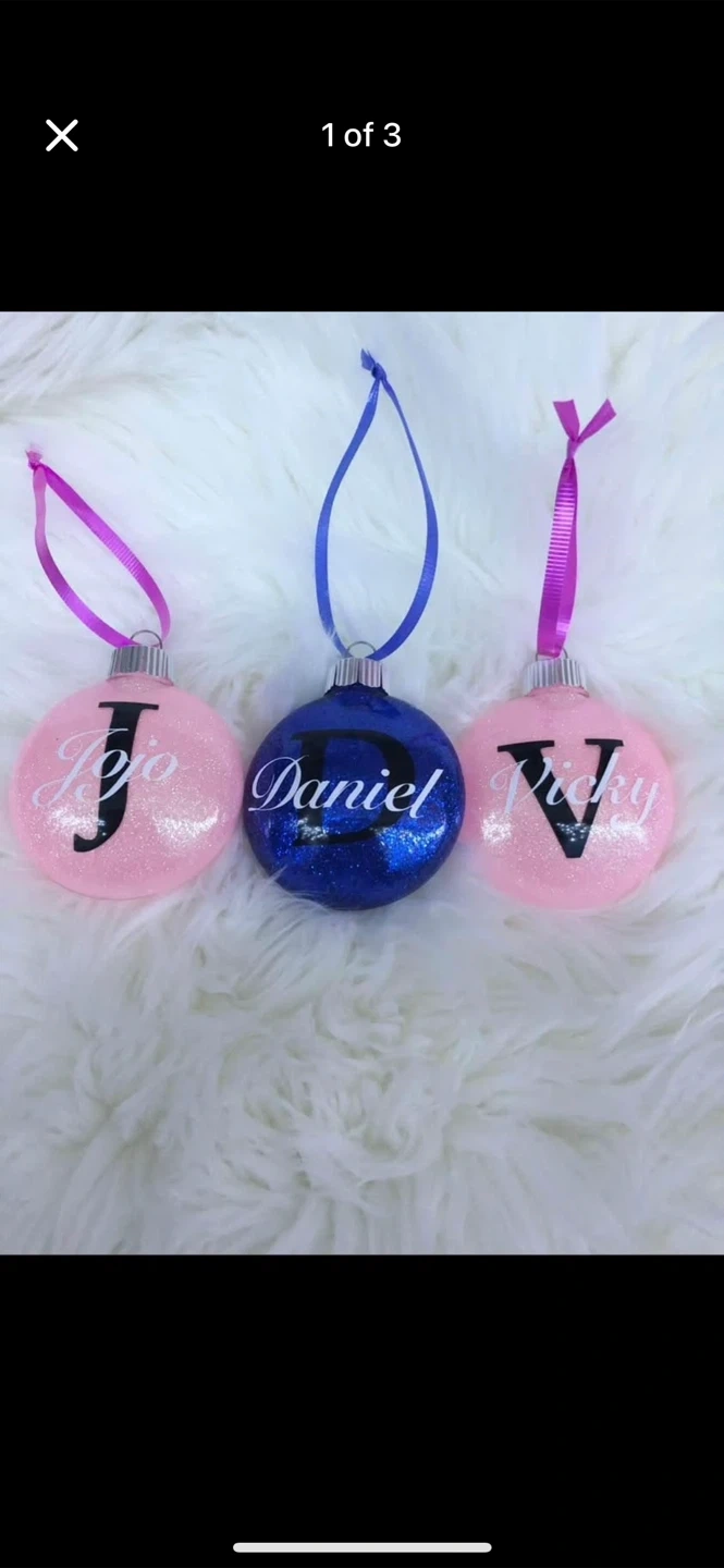 All ornaments can be customized with your choice of wordings & glitter colours and names!