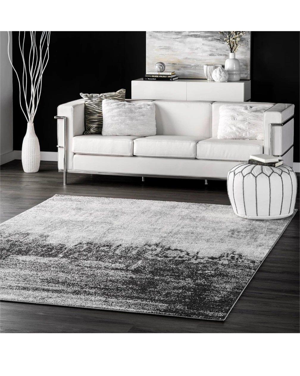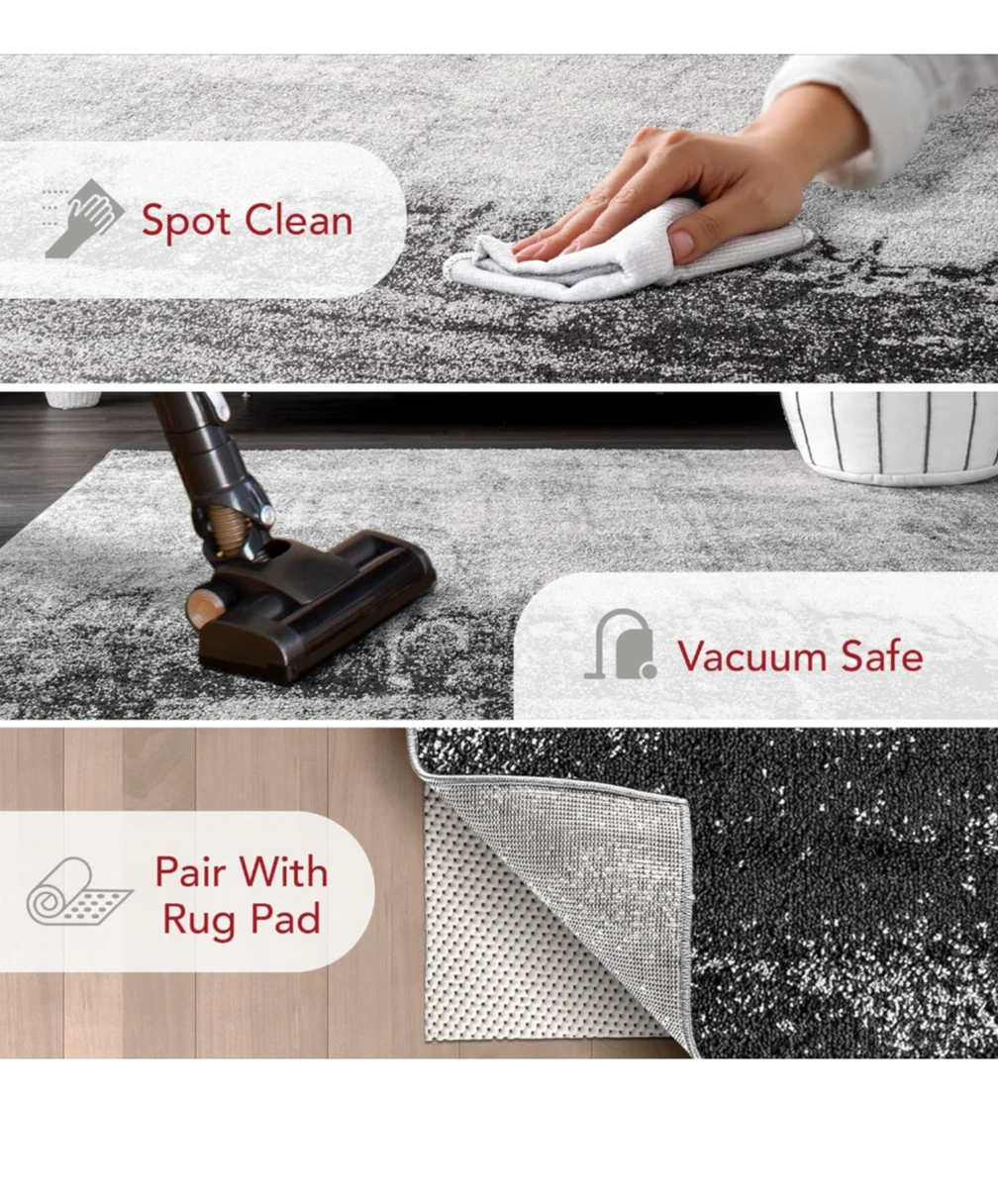 This area rug features a stylish blend of black and grey tones, perfect for adding a modern touch to any room. It's vacuum safe and easy to spot clean, making maintenance a breeze. It is pet and kids friendly.