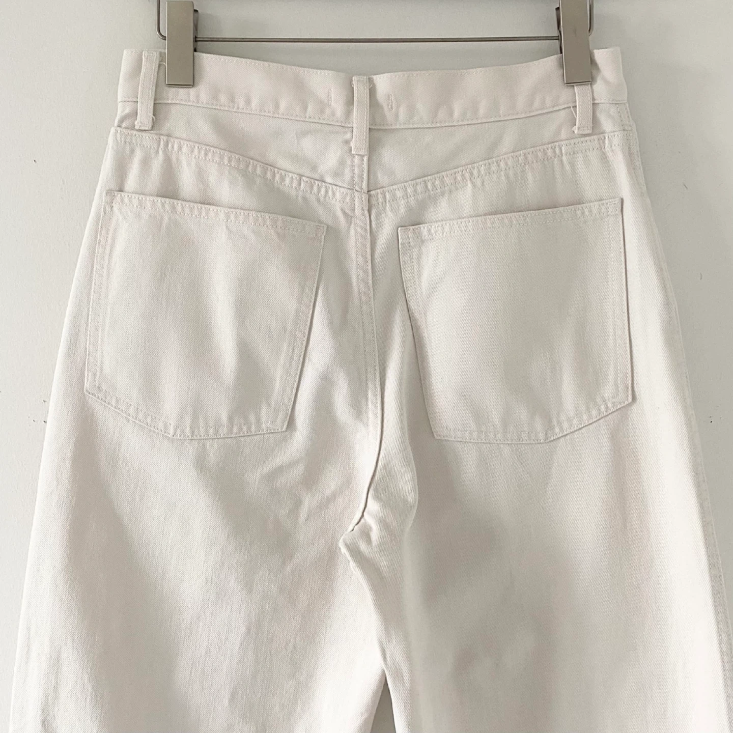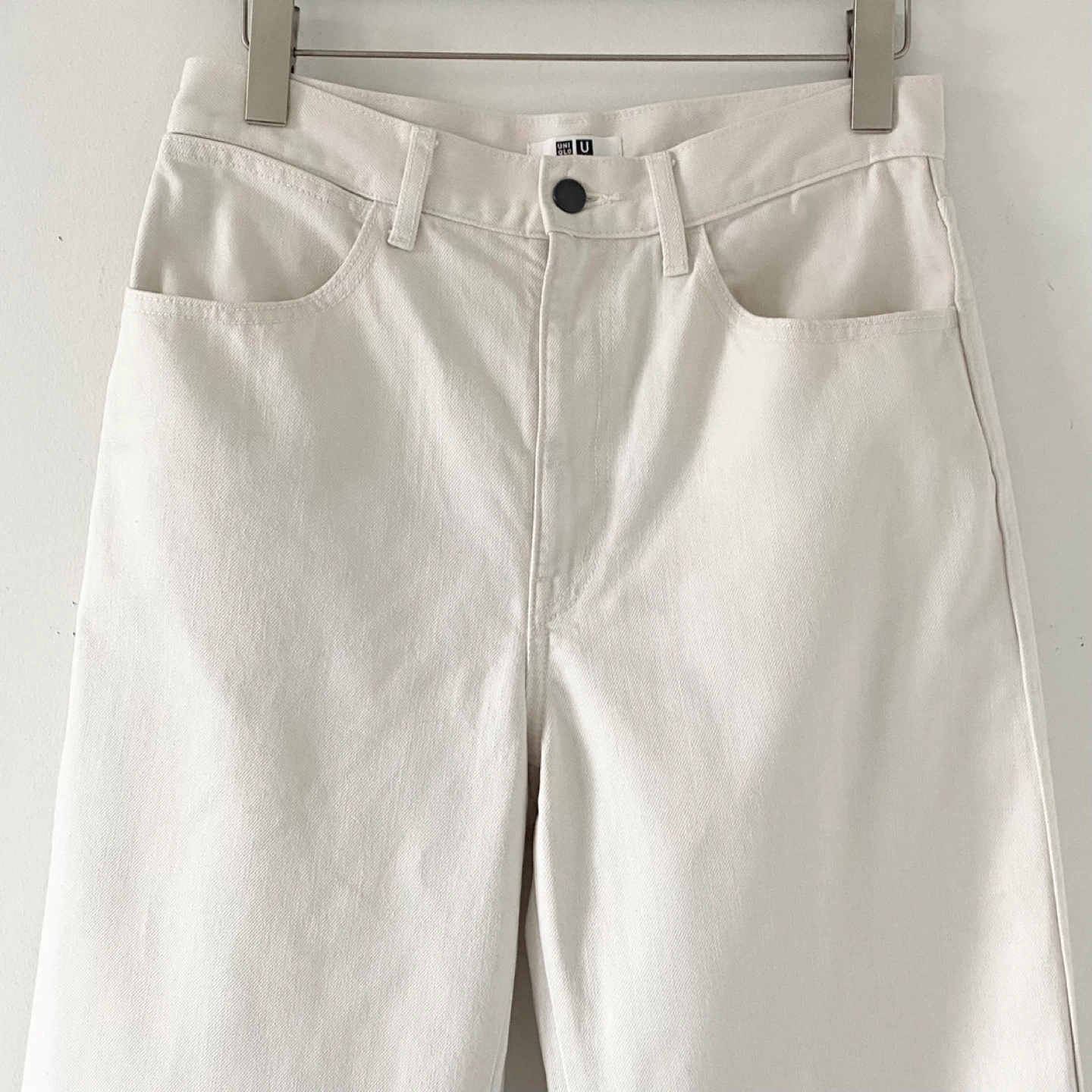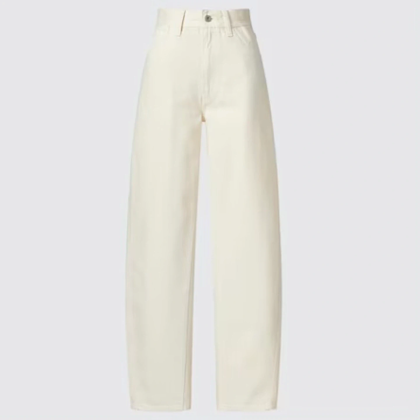 Uniqlo U wide fit curved jeans. Designed by Christophe Lemaire. Featuring a high-rise, wide-legged but tapered silhouette (balloon leg / barrel leg). Length has been professionally shortened slightly - they are now 29.5" inseam. Made of medium weight 100% cotton in a cream colour. There's no staining or damage. They are clean and in excellent condition.
