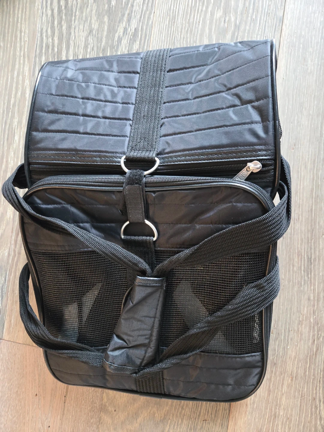 This is a Sherpa black pet carrier bag. It features a zippered opening and a mesh window for ventilation. It also includes straps for carrying. Like new condition.