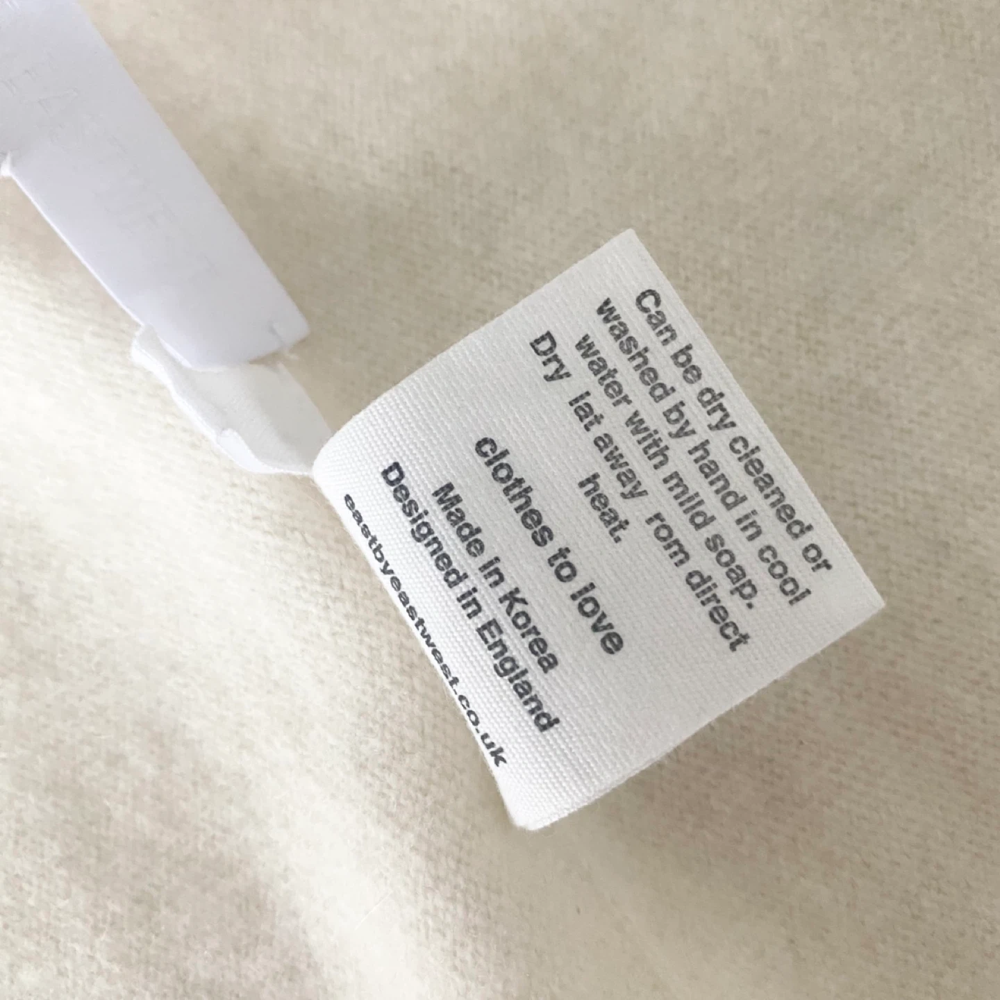 East By East West turtleneck sweater. Features a wider / boxy body with slim sleeves. Made of lightweight 90% wool and 10% cashmere in a cream colour. Incredibly well made - there are no arm holes and all seams are so tiny and flat, they are almost invisible as per the last pic. It's super soft, cozy and luxe. I don't find it itchy but it's subjective. There's a tiny faint mark (barely visible). Otherwise there's no pilling, snags or damage. It's clean and in excellent condition.