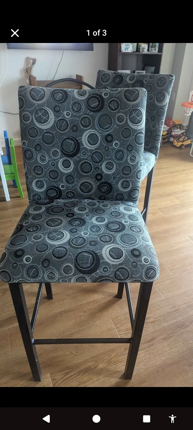 60Selling a set of three bar stools. They have a grey patterned fabric on the seat and back, and dark metal legs. They're in great shape and would look great in any kitchen or bar area! Made in Canada!