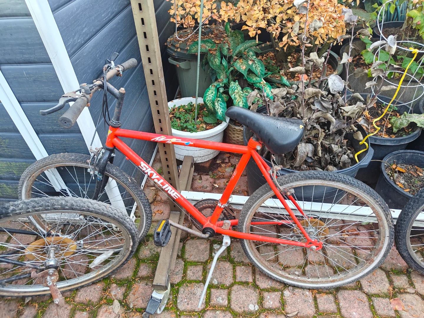 16Selling a red Skyline mountain bike. It's got some wear and tear, but it's still a solid ride! Perfect for cruising around the neighbourhood or hitting some light trails