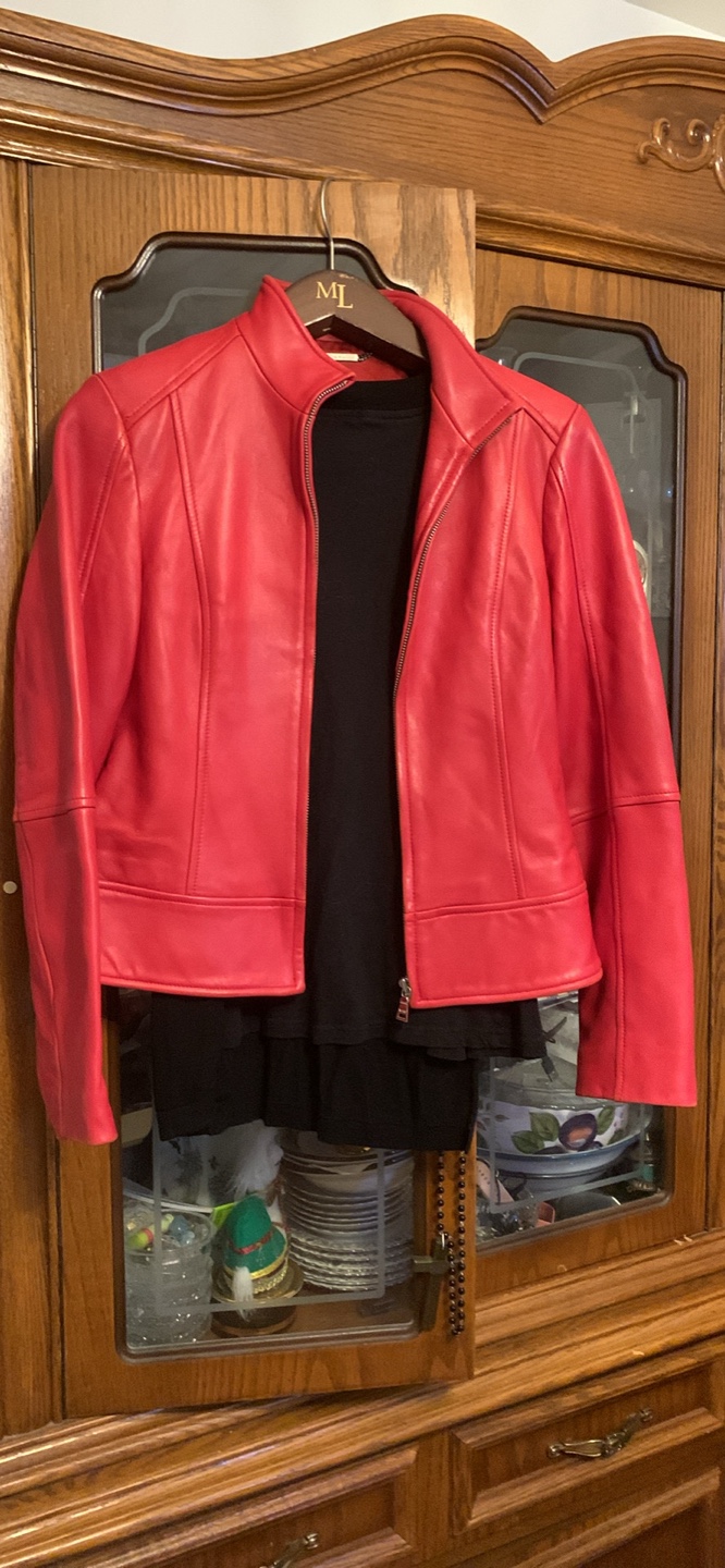 Selling a vibrant red leather jacket from MARC. It's a size small and made with 100% leather shell and acetate lining. Great for adding a pop of colour to any outfit!