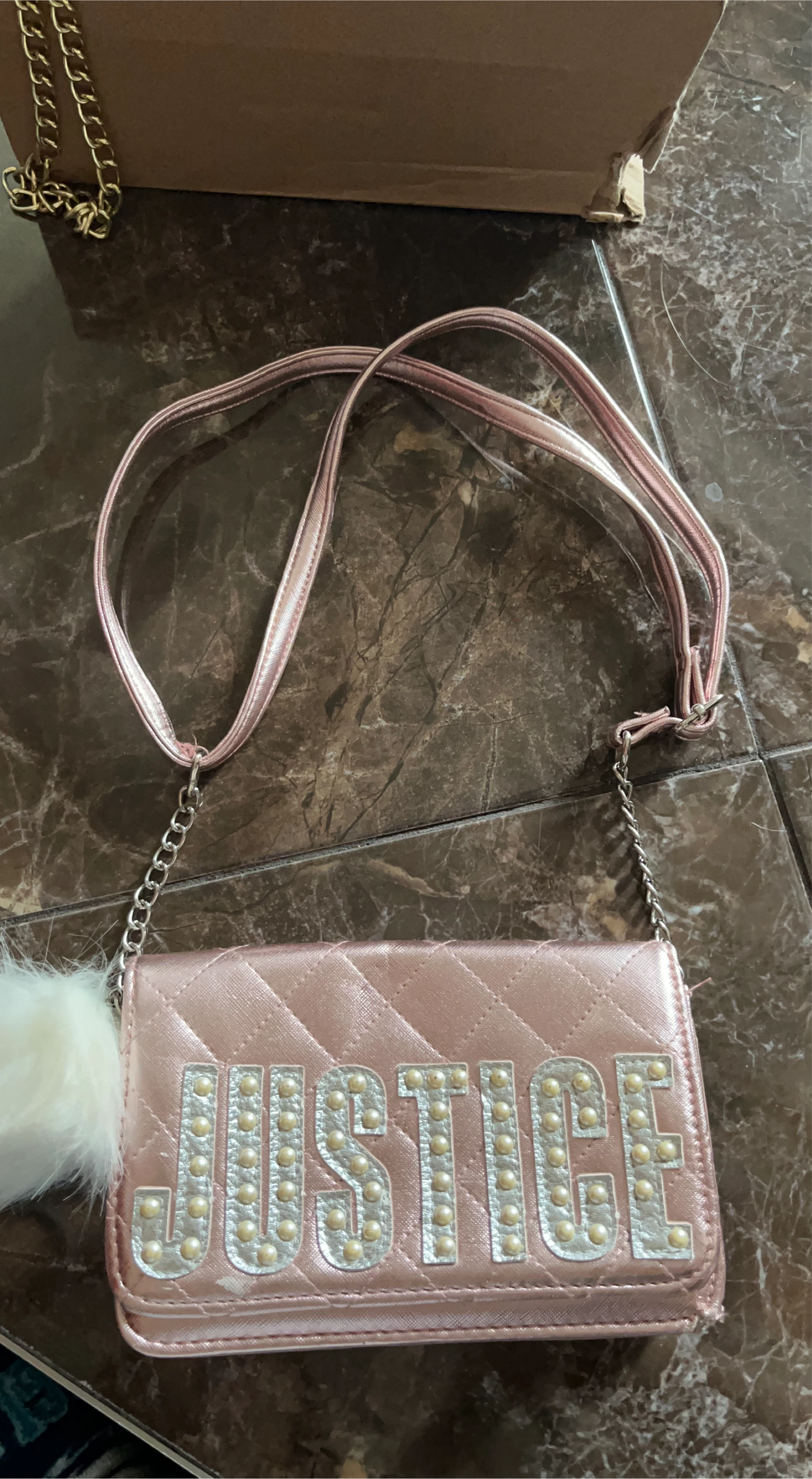 Selling a cute pink crossbody bag from Justice! It features a quilted design and the word "JUSTICE" spelled out with pearl-like embellishments. Perfect for a little one who loves to accessorize